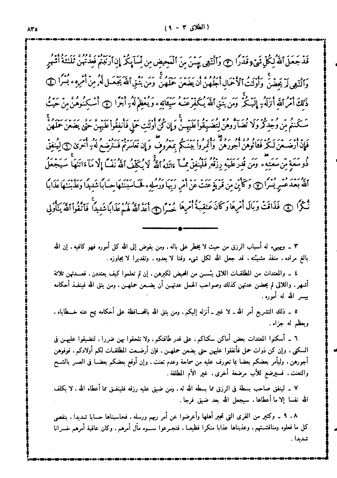 6 - أسكنوا المعتدات بعض أماكن سكناكم، على قدر طاقتكم، ولا تلحقوا بهن ضرراً، لتضيقوا عليهن فى السكنى. وإن كن ذوات حمل فأنفقوا عليهن حتى يضعن حملهن، فإن أرضعت المطلقات لكم أولادكم فوفوهن أجورهن، وليأمر بعضكم بعضاً بما تُعورف عليه من سماحة وعدم تعنّت، وإن اختلف الرجل والمرأة فطلبت المرأة فى أجرة الرضاع كثيرا ولم يجبها الرجل إلى ذلك أو بذل الرجل قليلاً ولم توافقه عليه فليسترضع غيرها.