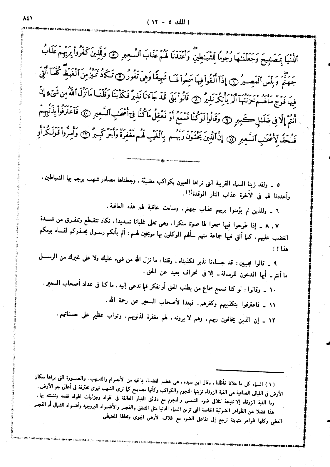 5 - ولقد زيَّنا السماء القريبة التى تراها العيون بكواكب مضيئة، وجعلناها مصادر شهب، يُرْجَم بها الشياطين، وأعددنا لهم فى الآخرة عذاب النار الموقدة.