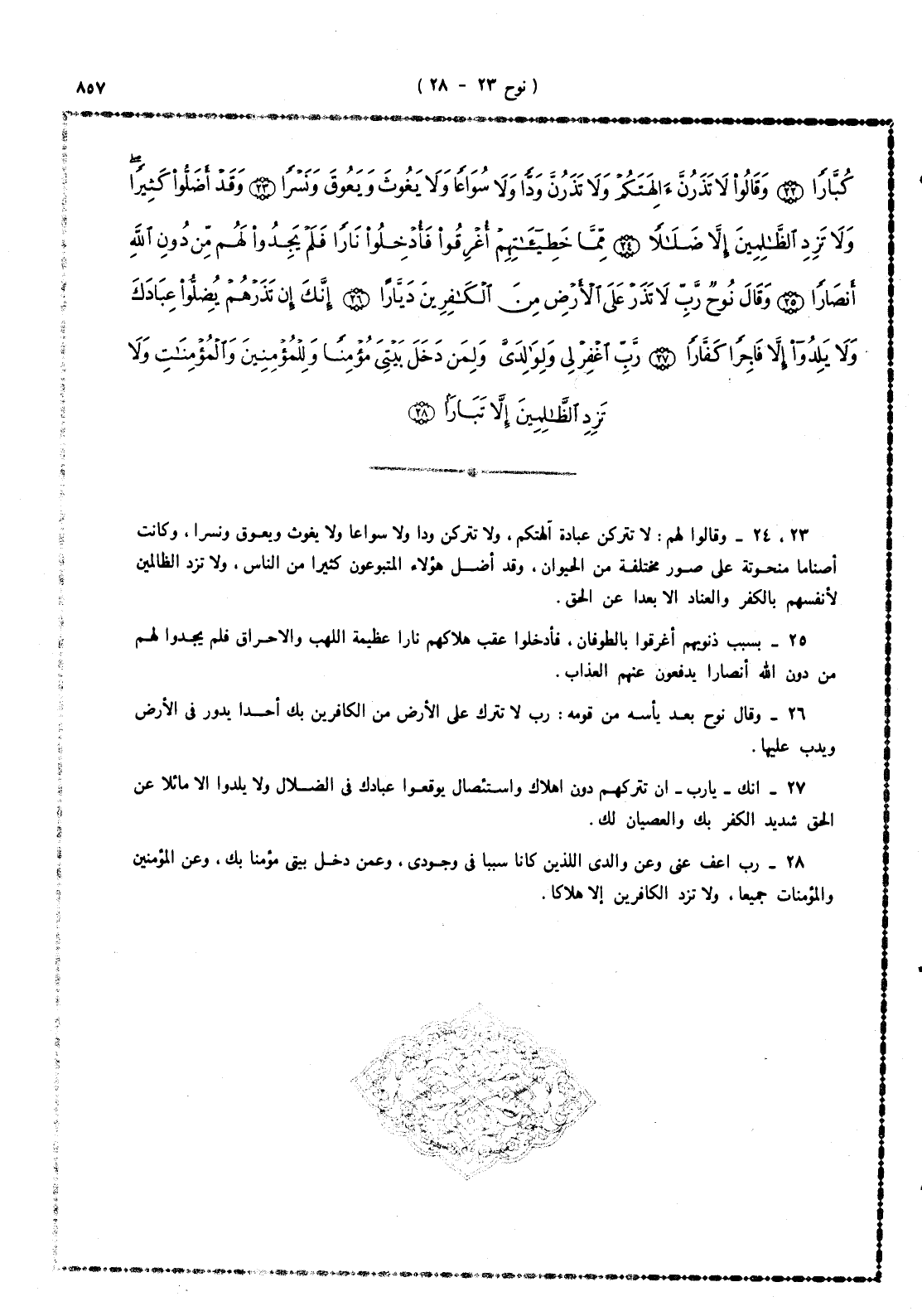 23 -، 24 - وقالوا لهم: لا تترُكنَّ عبادة آلهتكم، ولا تترُكُنَّ ودَّا ولا سواعاً ولا يغُوثَ ويعُوقَ ونسرا - وكانت أصناماً منحوتة على صور مختلفة من الحيوان - وقد أضل هؤلاء المتبوعون كثيراً من الناس، ولا تزد الظالمين لأنفسهم بالكفر والعناد إلا بُعداً عن الحق.