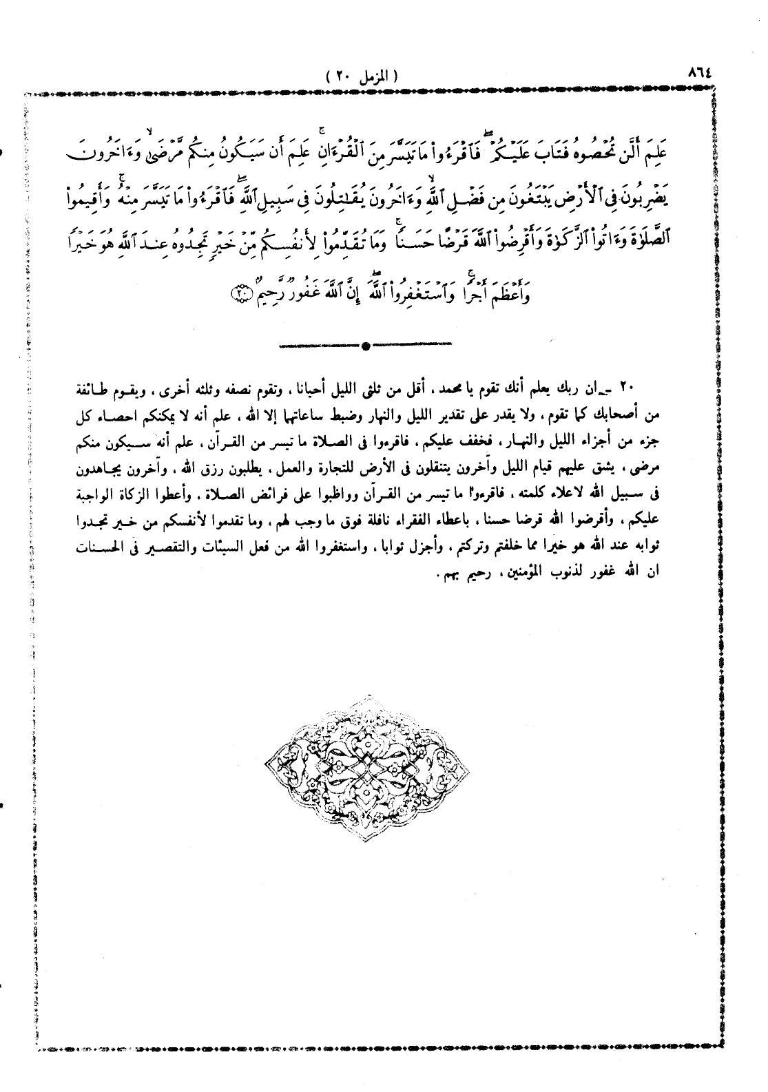 20 - إن ربك يعلم أنك تقوم - يا محمد - أقل من ثلثى الليل أحياناً، وتقوم نصفه وثلثه أحياناً أخرى، ويقوم طائفة من أصحابك كما تقوم، ولا يقدر على تقدير الليل والنهار وضبط ساعاتهما إلا الله. علم أنه لا يمكنكم إحصاء كل جزء من أجزاء الليل والنهار. فخفف عليكم، فاقرءوا فى الصلاة ما تيسر من القرآن. علم أنه سيكون منكم مرضى يشق عليهم قيام الليل، وآخرون يتنقلون فى الأرض للتجارة والعمل يطلبون رزق الله، وآخرون يجاهدون فى سبيل الله لإعلاء كلمته، فاقرءوا ما تيسر من القرآن وواظبوا على فرائض الصلاة، وأعطوا الزكاة الواجبة عليكم، وأقرضوا الله قرضاً حسناً بإعطاء الفقراء نافلة فوق ما وجب لهم، وما تقدموا لأنفسكم من خير تجدوا ثوابه عند الله هو خيراً مما خلفتم وتركتم، وأجزل ثواباً، واستغفروا الله من فعل السيئات والتقصير فى الحسنات. إن الله غفور لذنوب المؤمنين، رحيم بهم.