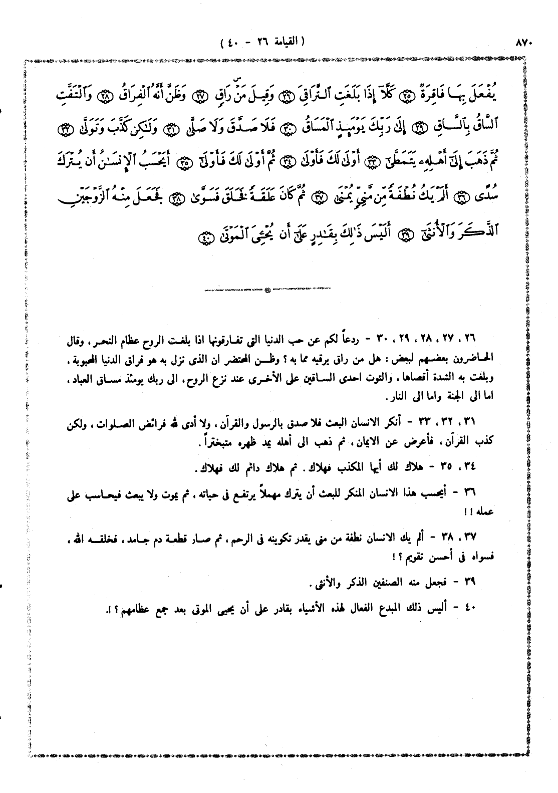 26 -، 27، 28، 29، 30 - ردعاً لكم عن حب الدنيا التى تفارقونها إذا بلغت الروح عظام النحر، وقال الحاضرون بعضهم لبعض: هل من راق يرقيه مما به؟ وظن المحتضر أن الذى نزل به هو فراق الدنيا المحبوبة، وبلغت به الشدة أقصاها، والتوت إحدى الساقين على الأخرى عند نزع الروح، إلى ربك يومئذٍ مساق العباد، إما إلى الجنة وإما إلى النار.