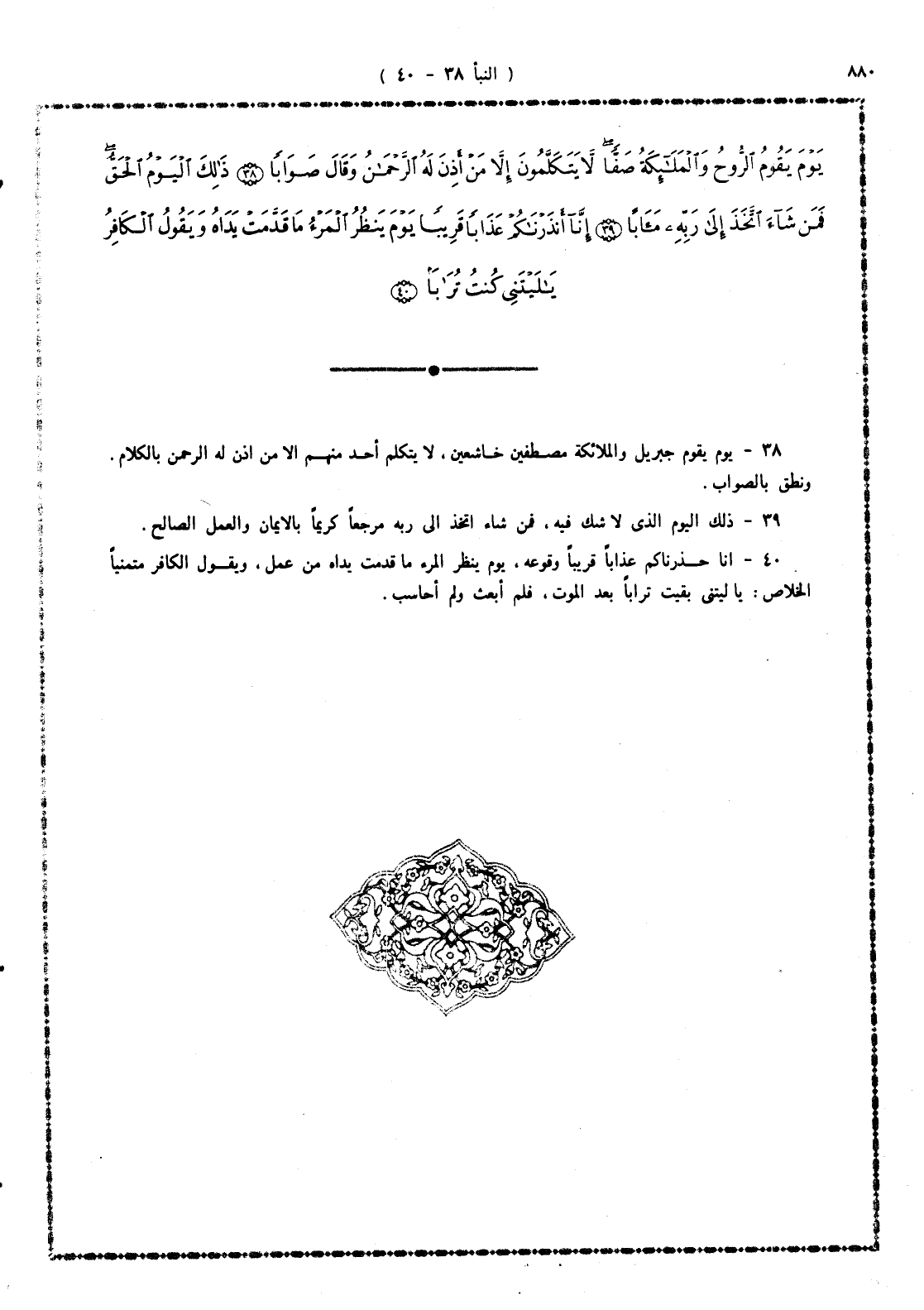 40 - إنا حذَّرناكم عذاباً قريباً وقوعه. يوم ينظر المرء ما قدَّمت يداه من عمل، ويقول الكافر متمنياً الخلاص: يا ليتنى بقيت تراباً بعد الموت، فلم أبعث ولم أحاسب.