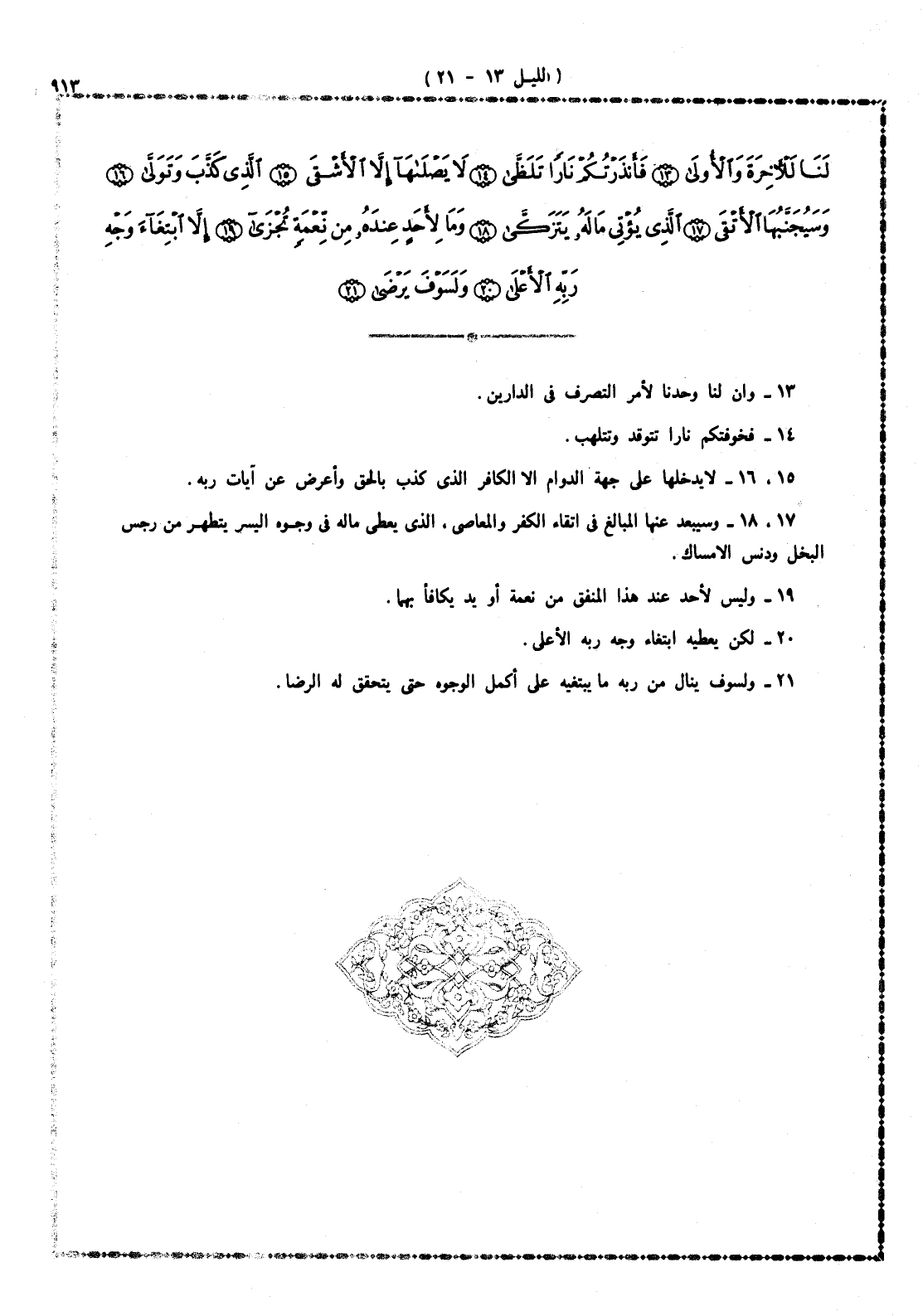 17 -، 18 - وسيُبعد عنها المبالغ الأكثر خشية لله وإعراضا عن معاصيه. الذى يعطى ماله فى وجوه اليسر يتطهر من رجس البخل ودنس الإمساك.