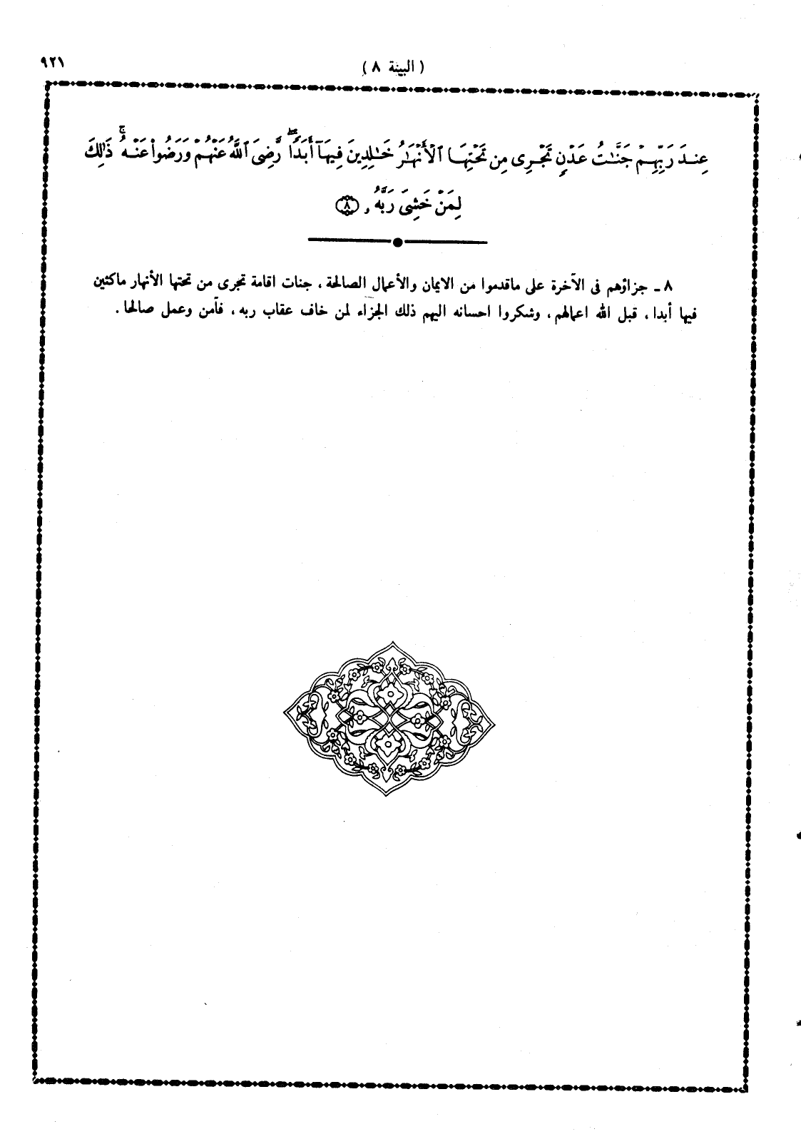 8 - جزاؤهم فى الآخرة على ما قدموا من الإيمان والأعمال الصالحة، جنات إقامة تجرى من تحتها الأنهار ماكثين فيها أبداً، قَبِلَ الله أعمالهم، وشكروا إحسانه إليهم. ذلك الجزاء لمَن خاف عقاب ربه، فآمن وعمل صالحاً.