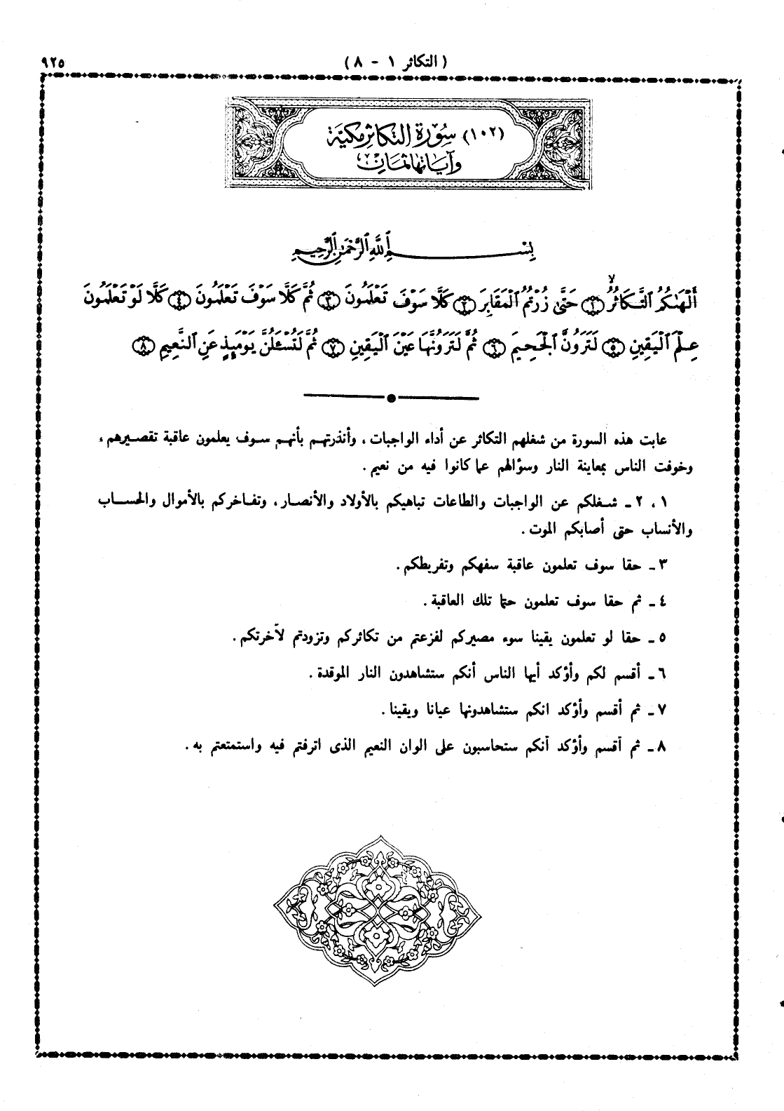 1 -، 2 - شغلكم عن الواجبات والطاعات تباهيكم بالأولاد والأنصار، وتفاخركم بالأموال والأحساب والأنساب حتى أصابكم الموت.