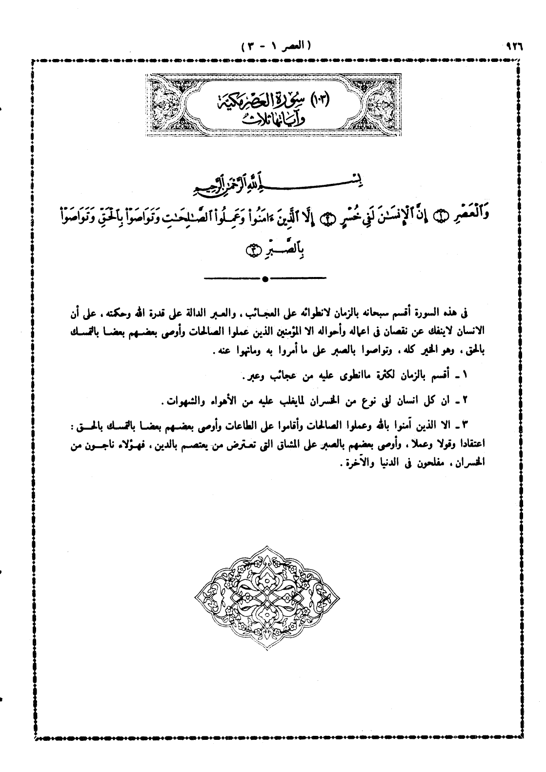 3 - إلا الذين آمنوا بالله وعملوا الصالحات، وأقاموا على الطاعات، وأوصى بعضهم بعضا بالتمسك بالحق اعتقادا وقولاً وعملاً، وأوصى بعضهم بعضا بالصبر على المشاق التى تعترض مَن يعتصم بالدين، فهؤلاء ناجون من الخسران. مُفلحون فى الدنيا والآخرة.