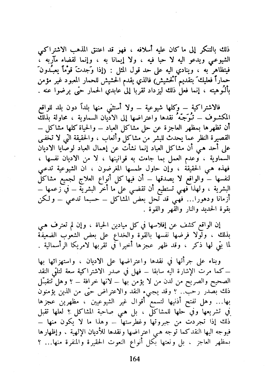 فالاشتراكية - وكلها شيوعية - ولا أستثني منها بلدا دون بلد للواقع المكشوف - توجه نقدها واعتراضها إلى الأديان السماوية، محاولة بذلك أن تظهرها بمظهر العاجزة عن حل مشاكل العباد - والحياة كلها مشاكل - القصيرة النظر عما يحدث للبشر من مشاكل وأتعاب، والحقيقة التي لا تخفى على أحد هي أن مشاكل العباد إنما نشأت عن إهمال العباد لوصايا الأديان السماوية، وعدم العمل بما جاءت به قوانينها، لا من الأديان نفسها، فهذه هي الحقيقة، وإن حاول طمسها المغرضون، إن الشيوعية تدعي لنفسها - والواقع لا يصدقها - أن فيها كل أنواع العلاج لجميع مشاكل البشرية، ولهذا فهي تستطيع أن تقضي على ما أخر البشرية - في زعمها - أزمانا ودهورا ... فهي قد تحل بعض المشاكل - حسبما تدعي - ولكن بقوة الحديد والنار والقهر والقوة.