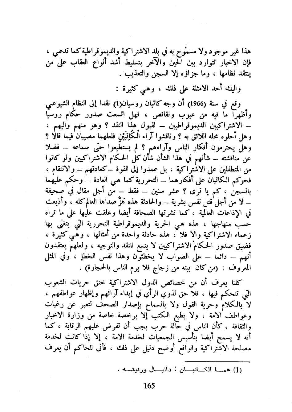 وقع في سنة (1966) أن وجه كاتبان روسيان (¬1) نقدا إلى النظام الشيوعي وأظهرا ما فيه من عيوب ونقائص، فهل اتسعت صدور حكام روسيا - الاشتراكيين الديموقراطيين - لقبول هذا النقد؟ وهو منهم وإليهم، وهل أحلوه محله اللائق به؟ وناقشوا آراء الكاتبين فلعلهما مصيبان فيما قالا؟ وهل يحترمون أفكار الناس وآراءهم؟ لم يستطيعوا حتى سماعه - فضلا عن مناقشته - شأنهم في هذا الشأن شأن كل الحكام الاشتراكيين ولو كانوا من المتطفلين على الاشتراكية، بل عمدوا إلى القوة - كعادتهم - والانتقام، فحوكم الكاتبان على أفكارهما - التحررية كما هي العادة - وحكم عليهما بالسجن، كم يا ترى؟ عشر سنين - فقط - من أجل مقال في صحيفة - لا من أجل قتل نفس بشرية - والحادثة هذه هز صداها العالم كله، وأذيعت في الإذاعات العالمية، كما نشرتها الصحافة أيضا وعلقت عيها على ما تراه حسب منهاجها، هذه هي الحرية والديموقراطية التحررية التي يتغنى بها زعماء الاشتراكية وإلا فلا، هذه حادثة واحدة من أمثالها، وهي كثيرة، فضيق صدور الحكام الاشتراكيين لا يتسع للنقد والتوجيه، ولعلهم يعتقدون أنهم - دائما - على الصواب لا يخطئون وهذا نفس الخطإ، وفي المثل المعروف: (من كان بيته من زجاج فلا يرم الناس بالحجارة).