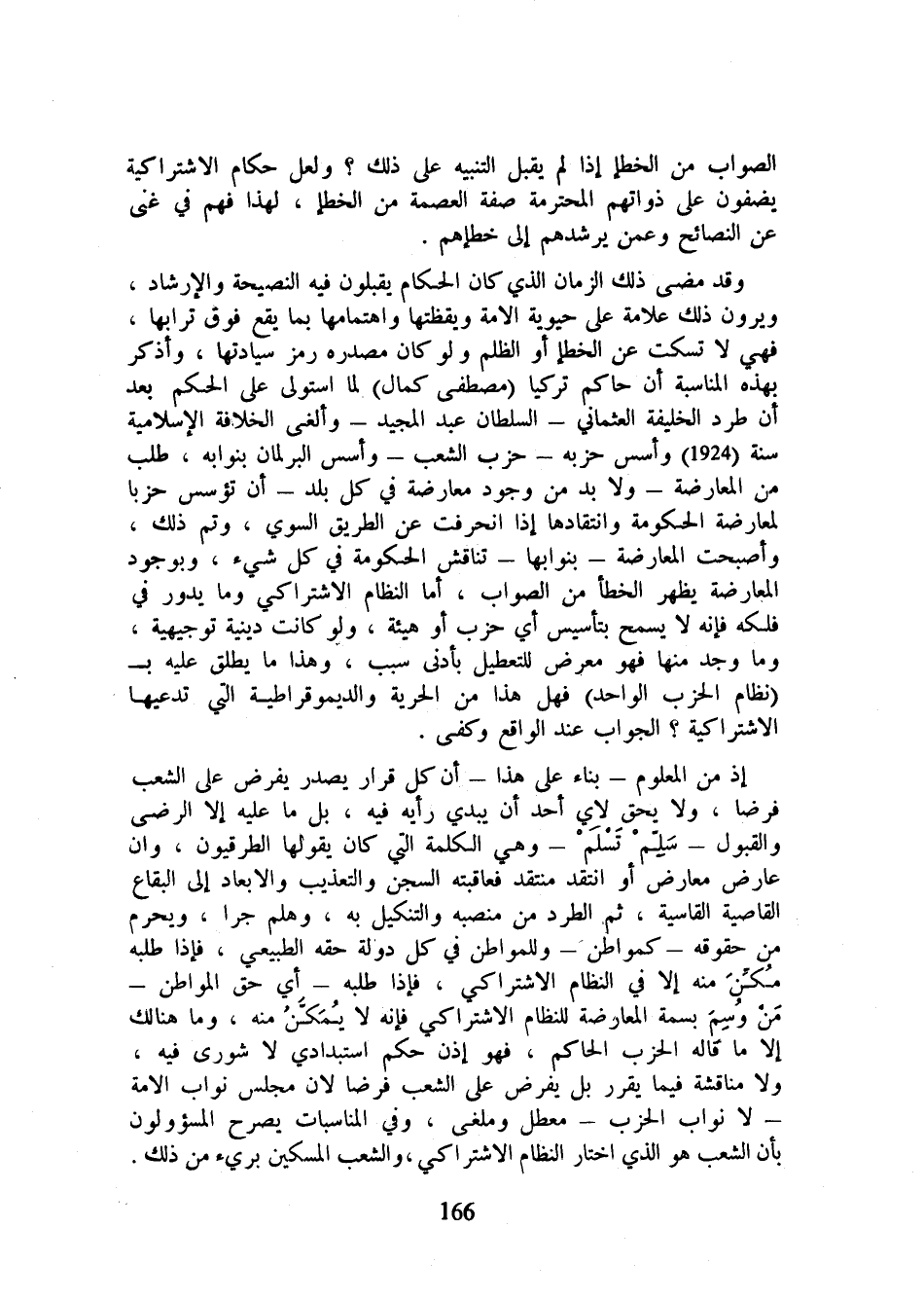 وقد مضى ذلك الزمان الذي كان الحكام يقبلون فيه النصيحة والإرشاد، ويرون ذلك علامه على حيوية الأمة ويقظتها واهتمامها بما يقع فوق ترابها، فهي لا تسكت عن الخطإ أو الظلم ولو كان مصدره رمز سيادتها، وأذكر بهذه المناسبة أن حاكم تركيا (مصطفى كمال) لما استولى على الحكم بعد أن طرد الخليفة العثماني - السلطان عبد المجيد - وألغى الخلافة الإسلامية سنة (1924) وأسس حزبه - حزب الشعب - وأسس البرلمان بنوابه، طلب من المعارضة - ولا بد من وجود معارضة في كل بلد - أن تؤسس حزبا لمعارضة الحكومة وانتقادها إذا انحرفت عن الطريق السوي، وتم ذلك، وأصبحت المعارضة - بنوابها - تناقش الحكومة في كل شيء، وبوجود المعارضة يظهر الخطأ من الصواب، أما النظام الاشتراكي وما يدور في فلكه فإنه لا يسمح بتأسيس أي حزب أو هيئة، ولو كانت دينية توجيهية، وما وجد منها فهو معرض للتعطيل بأدنى سبب، وهذا ما يطلق عليه بـ (نظام الحزب الواحد) فهل هذا من الحرية والديموقراطية التي تدعيها الاشتراكية؟ الجواب عند الواقع وكفى.