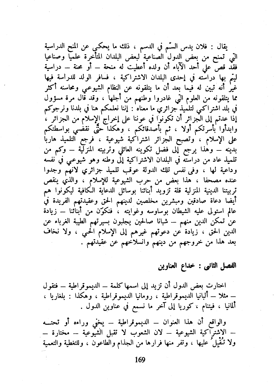 والواقع أن هذا العنوان - الديموقراطية - يخفي وراءه أو تحته - الاشتراكية الشيوعية - لأن الشعوب لا تقبل الشيوعية - مختارة - ولا تقبل عليها، وتفر منها فرارها من الجذام والطاعون، وللتغطية والتعمية
