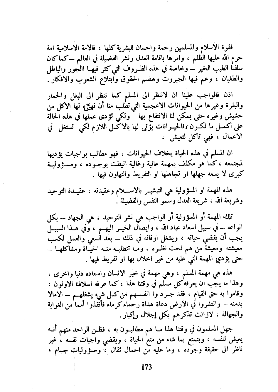 إذن فالواجب علينا أن لا ننظر إلى المسلم كما ننظر إلى البغل والحمار والبقرة وغيرها من الحيوانات الأعجمية التي تطلب منا أن نهيئ لها الأكل من حشيش وغيره حتى يمكن لنا الانتفاع بها ولكي تؤدي عملها في هذه الحالة على أكمل ما تكون، فالحيوانات يؤتى لها بالأكل اللازم لكي تستغل في الأعمال، فهي تأكل لتعيش.