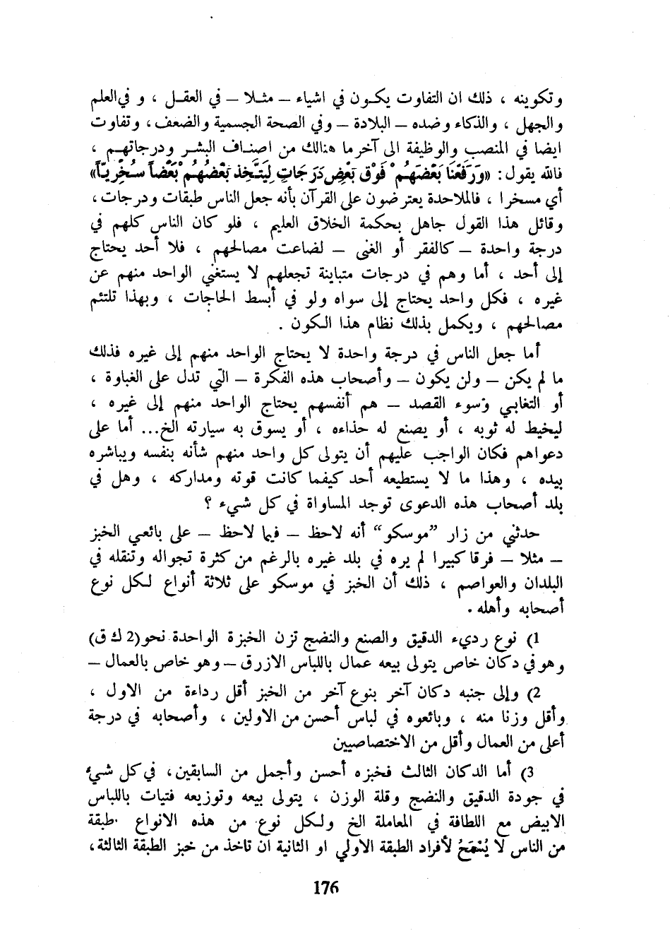 وتكوينه، ذلك أن التفاوت يكون في أشياء - مثلا - في العقل، وفي العلم والجهل، والذكاء وضده - البلادة - وفي الصحة الجسمية والضعف، وتفاوت أيضا في المنصب والوظيفة إلى آخر ما هنالك من أصناف البشر ودرجاتهم، فالله يقول: {وَرَفَعْنَا بَعْضَهُمْ فَوْقَ بَعْضٍ دَرَجَاتٍ لِيَتَّخِذَ بَعْضُهُمْ بَعْضًا سُخْرِيًّا} أي مسخرا، فالملاحدة يعترضون على القرآن بأنه جعل الناس طبقات ودرجات، وقائل هذا القول جاهل بحكمة الخلاق العليم، فلو كان الناس كلهم في درجة واحدة - كالفقر أو الغنى - لضاعت مصالحهم، فلا أحد يحتاج إلى أحد، أما وهم في درجات متباينة تجعلهم لا يستغني الواحد منهم عن غيره، فكل واحد يحتاج إلى سواه ولو في أبسط الحاجات، وبهذا تلتئم مصالحهم، ويكمل بذلك نظام هذا الكون.