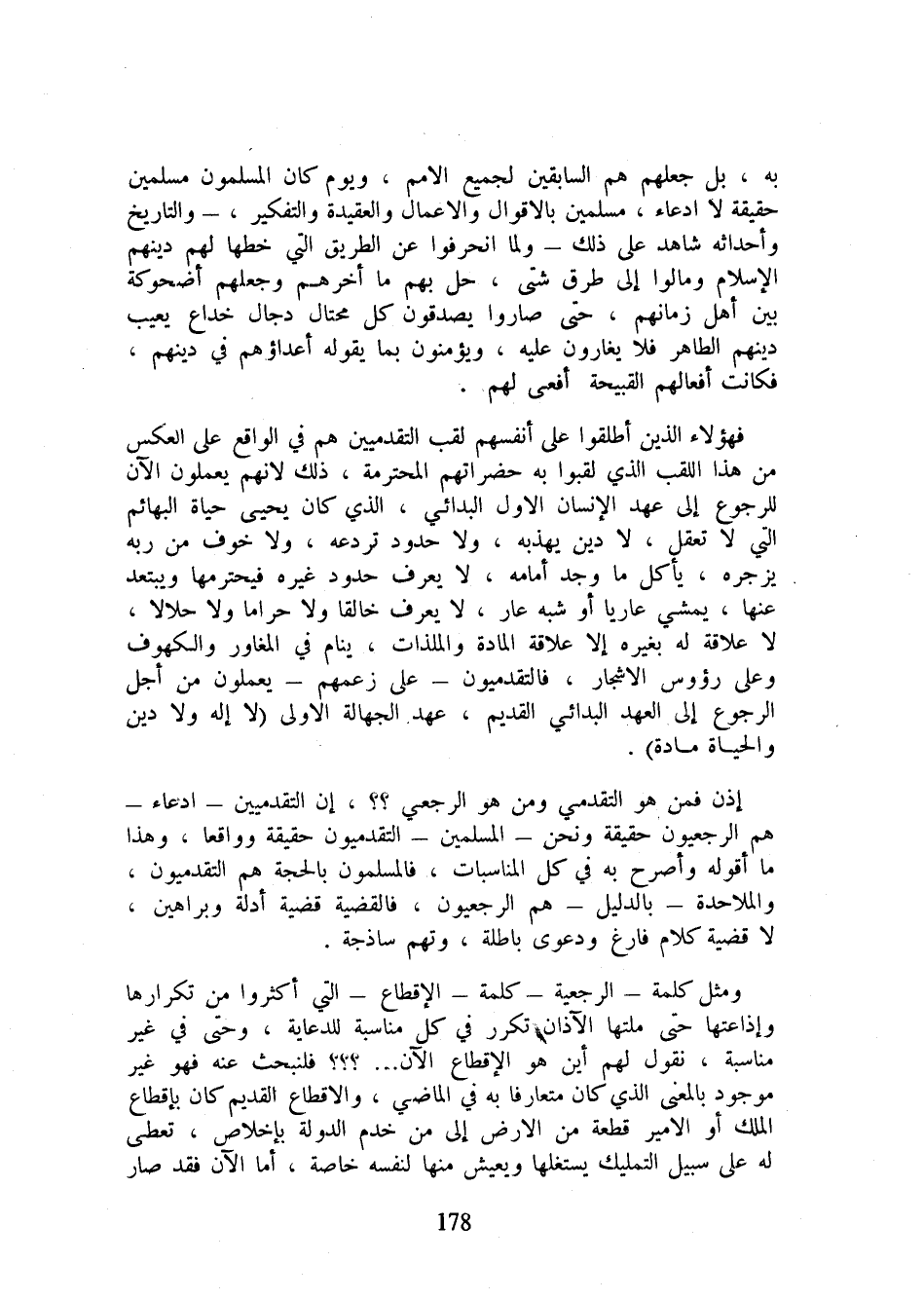 به، بل جعلهم هم السابقين لجميع الأمم، ويوم كان المسلمون مسلمين حقيقة لا ادعاء، مسلمين بالأقوال والأعمال والعقيدة والتفكير، - والتاريخ وأحداثه شاهد على ذلك - ولما انحرفوا عن الطريق التي خطها لهم دينهم الإسلام ومالوا إلى طرق شتى، حل بهم ما أخرهم وجعلهم أضحوكة بين أهل زمانهم، حتى صاروا يصدقون كل محتال دجال خداع يعيب دينهم الطاهر فلا يغارون عليه، ويؤمنون بما يقوله أعداؤهم في دينهم، فكانت أفعالهم القبيحة أفعى لهم.