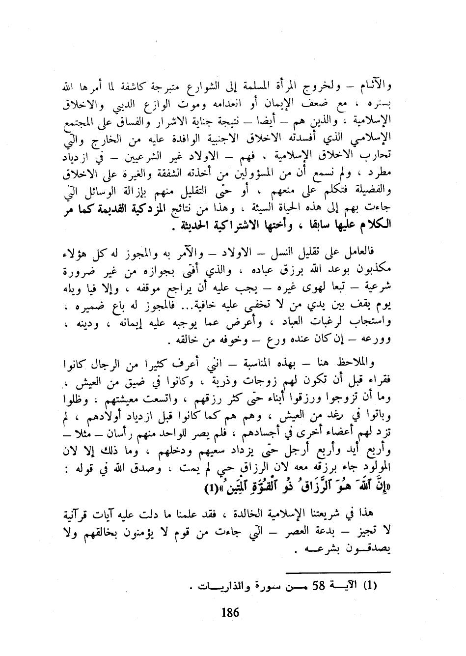 والآثام - ولخروج المرأة المسلمة إلى الشوارع متبرجة كاشفة لما أمرها الله بستره، مع ضعف الإيمان أو انعدامه وموت الوازع الديني والأخلاق الإسلامية، والذين هم - أيضا - نتيجة جناية الأشرار والفساق على المجتمع الإسلامي الذي أفسدته الأخلاق الأجنبية الوافدة عليه من الخارج والتي تحارب الأخلاق الإسلامية، فهم - الأولاد غير الشرعيين - في ازدياد مطرد، ولم نسمع أن من المسؤولين من أخذته الشفقة والغيرة على الأخلاق والفضيلة فتكلم على منعهم، أو حتى التقليل منهم بإزالة الوسائل التي جاءت بهم إلى هذه الحياة السيئة، وهذا من نتائج المزدكية القديمة كما مر الكلام عليها سابقا، وأختها الاشتراكية الحديثة.