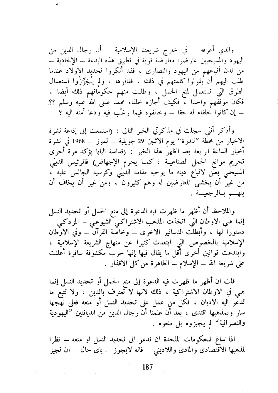 إذا ساغ للحكومات الملحدة أن تدعو إلى تحديد النسل أو منعه - نظرا لمذهبها الاقتصادي والمادي واللاديني - فإنه لا يجوز - بأي حال - أن تجيز