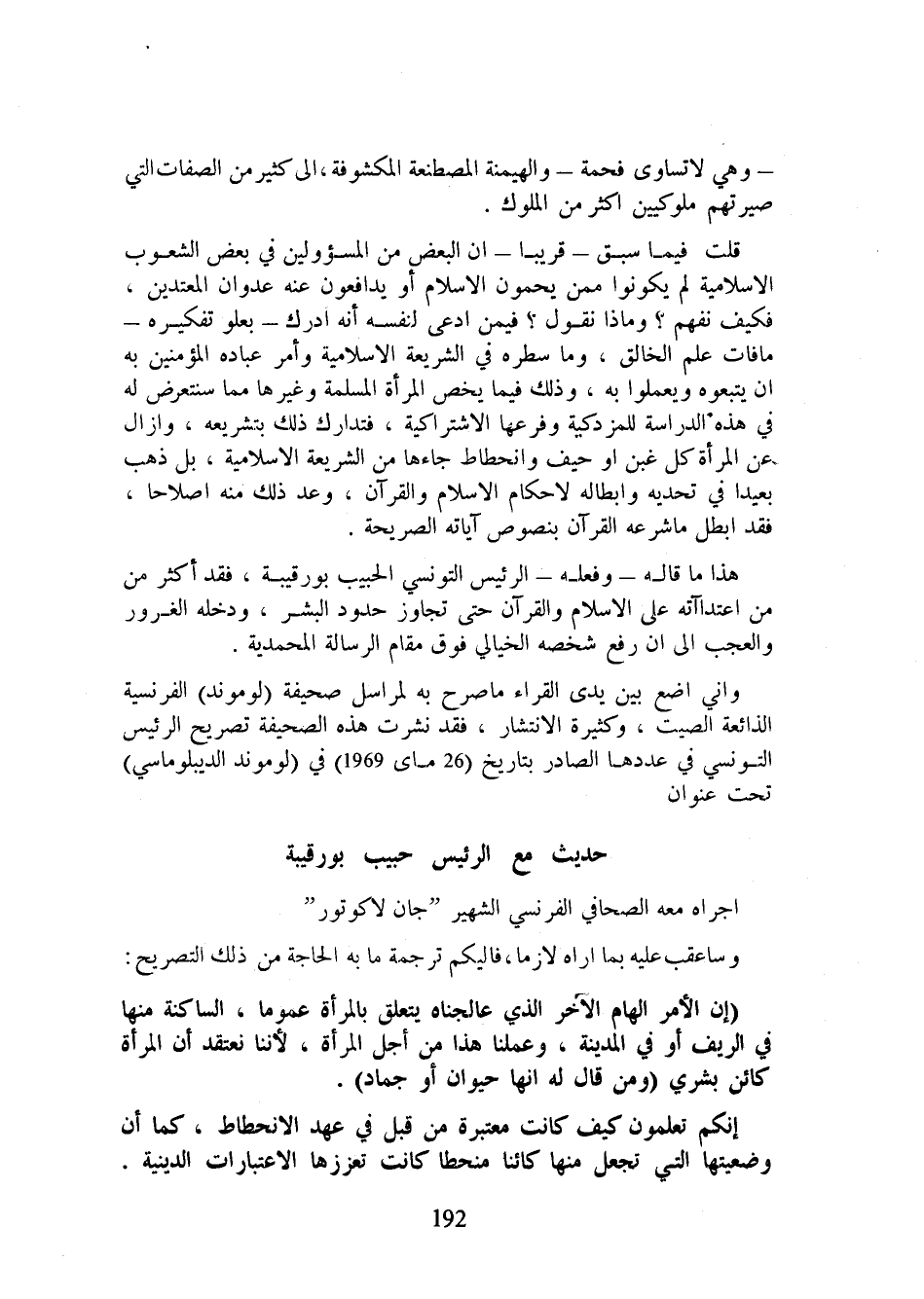 وإني أضع بين يدي القراء ما صرح به لمراسل صحيفة (لوموند) الفرنسية الذائعة الصيت، وكثيرة الانتثار، فقد نشرت هذه الصحيفة تصريح الرئيس التونسي في عددها الصادر بتاريخ (26 ماي 1969) في (لوموند الديبلوماسي) تحت عنوان: