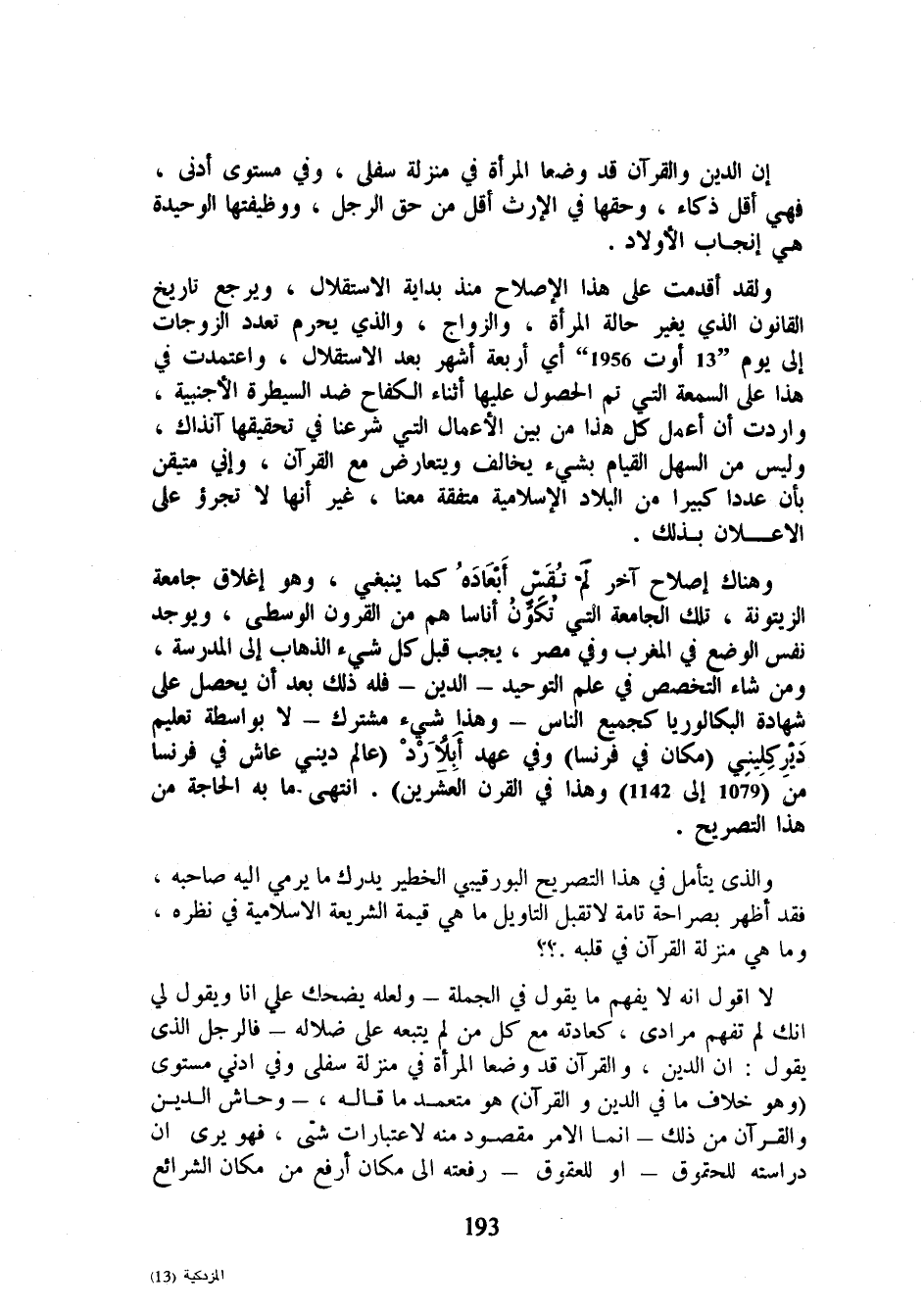 وهناك إصلاح آخر لم تقس أبعاده كما ينبغي، وهو إغلاق جامعة الزيتونة، تلك الجامعة التي تكون أناسا هم من القرون الوسطى، ويوجد نفس الوضع في المغرب وفي مصر، يجب قبل كل شيء الذهاب إلى المدرسة، ومن شاء التخصص في علم التوحيد - الدين - فله ذلك بعد أن يحصل على شهادة البكالوريا كجميع الناس - وهذا شيء مشترك - لا بواسطة تعليم ديركليني (مكان في فرنسا) وفي عهد أبلارد (عالم ديني عاش في فرنسا من (1079 إلى 1142) وهذا في القرن العشرين). انتهى ما به الحاجة من هذا التصريح.