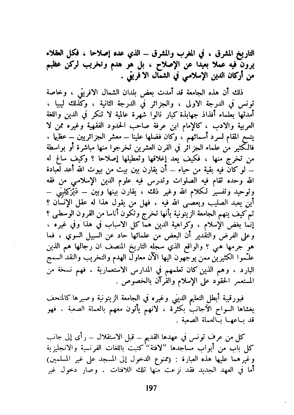 ذلك أن هذه الجامعة قد أمدت بعض بلدان الشمال الإفريقي، وخاصة تونس في الدرجة الأولى، والجزائر في الدرجة الثانية، وكذلك ليبيا، أمدتها بعلماء أفذاذ جهابذة كبار نالوا شهرة عالمية لا تنكر في الدين واللغة العربية والأدب، كالإمام ابن عرفة صاحب الحدود الفقهية وغيره ممن لا يتسع المقام لسرد أسمائهم، وكان فضلها علينا - معشر الجزائريين - عظيما، فالكثير من علماء الجزائر في القرن العشرين تخرجوا منها مباشرة أو بواسطة من تخرج منها، فكيف يعد إغلاقها وتعطيلها إصلاحا؟ وكيف ساغ له - لو كان فيه بقية من حياء - أن يقارن بين بيت من بيوت الله أعد لعبادة الله وحده تقام فيه الصلوات وتدرس فيه علوم الدين الإسلامي من فقه وتوحيد وتفسير لكلام الله وغير ذلك، يقارن بينها وبين - ديركليني - أين يعبد الصليب ويعصى الله فيه، فهل من يقول هذا له عقل الإنسان؟ ثم كيف يتهم الجامعة الزيتونية بأنها تخرج وتكون أناسا من القرون الوسطى؟ إنما بغض الإسلام، وكراهية الدين هما كل الأسباب في هذا وفي غيره، وعلى الفرض والتقدير أن البعض من علمائها حاد عن السبيل السوي، فما هو جرمها هي في والواقع الذي سجله التاريخ المنصف أن رجالها هم الذين علموا الكثيرين ممن يوجهون إليها الآن معاول الهدم والتخريب والنقد السمج البارد، وهم الذين كان تعلمهم في المدارس الاستعمارية، فهم نسخة من المستعمر الحقود على الإسلام والقرآن بالخصوص.
