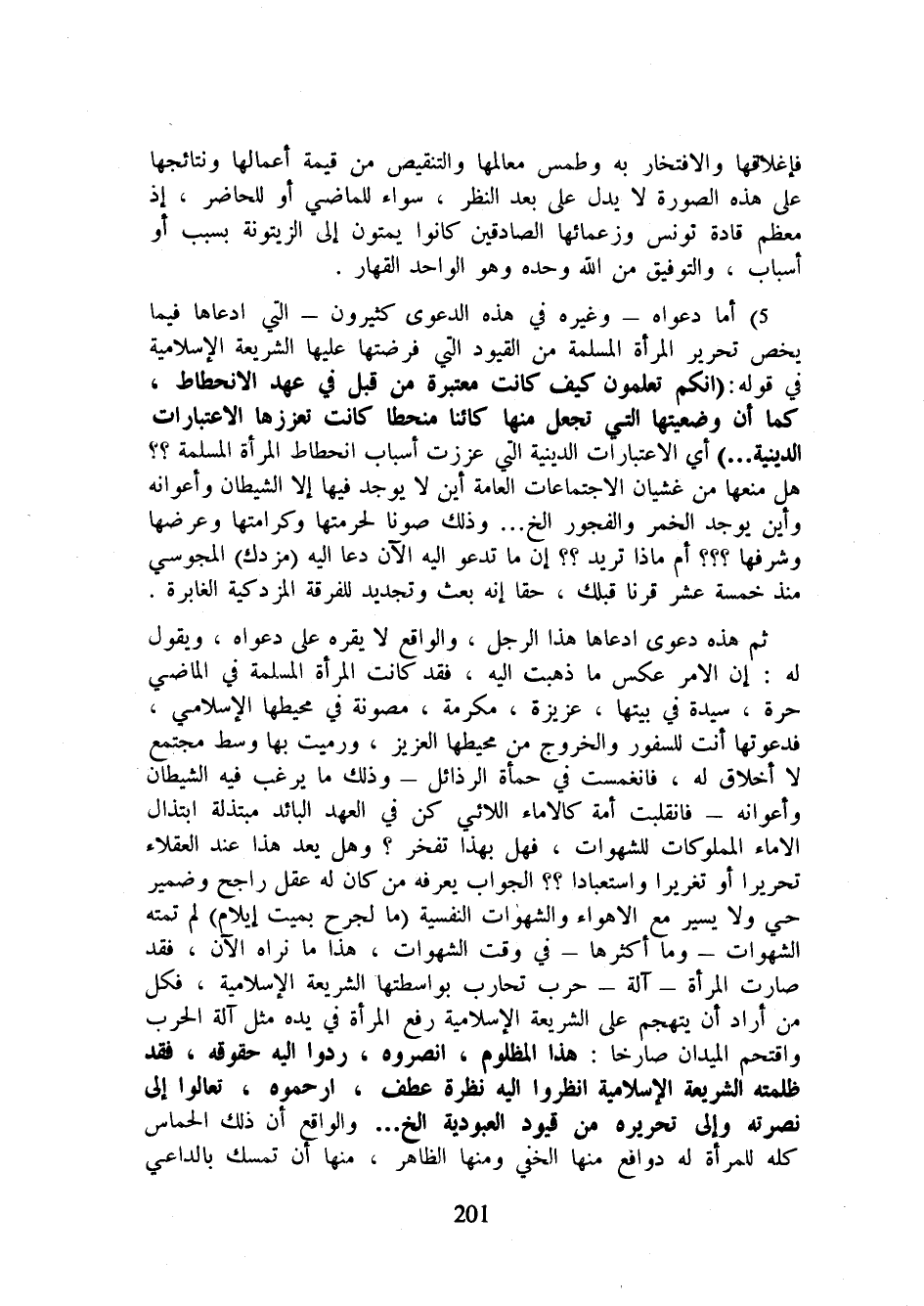 5 - أما دعواه - وغيره في هذه الدعوى كثيرون - التي ادعاها فيما يخص تحرير المرأة المسلمة من القيود التي فرضتها عليها الشريعة الإسلامية في قوله: (إنكم تعلمون كيف كانت معتبرة من قبل في عهد الانحطاط، كما أن وضعيتها التي تجعل منها كائنا منحطا كانت تعززها الاعتبارات الدينية ...) أي الاعتبارات الدينية التي عززت أسباب انحطاط المرأة المسلمة؟؟ هل منعها من غشيان الاجتماعات العامة أين لا يوجد فيها إلا الشيطان وأعوانه وأين يوجد الخمر والفجور الخ ... وذلك صونا لحرمتها وكرامتها وعرضها وشرفها؟؟؟ أم ماذا تريد؟؟ إن ما تدعو إليه الآن دعا إليه (مزدك) المجوسي منذ خمسة عشر قرنا قبلك، حقا إنه بعث وتجديد للفرقة المزدكية الغابرة.