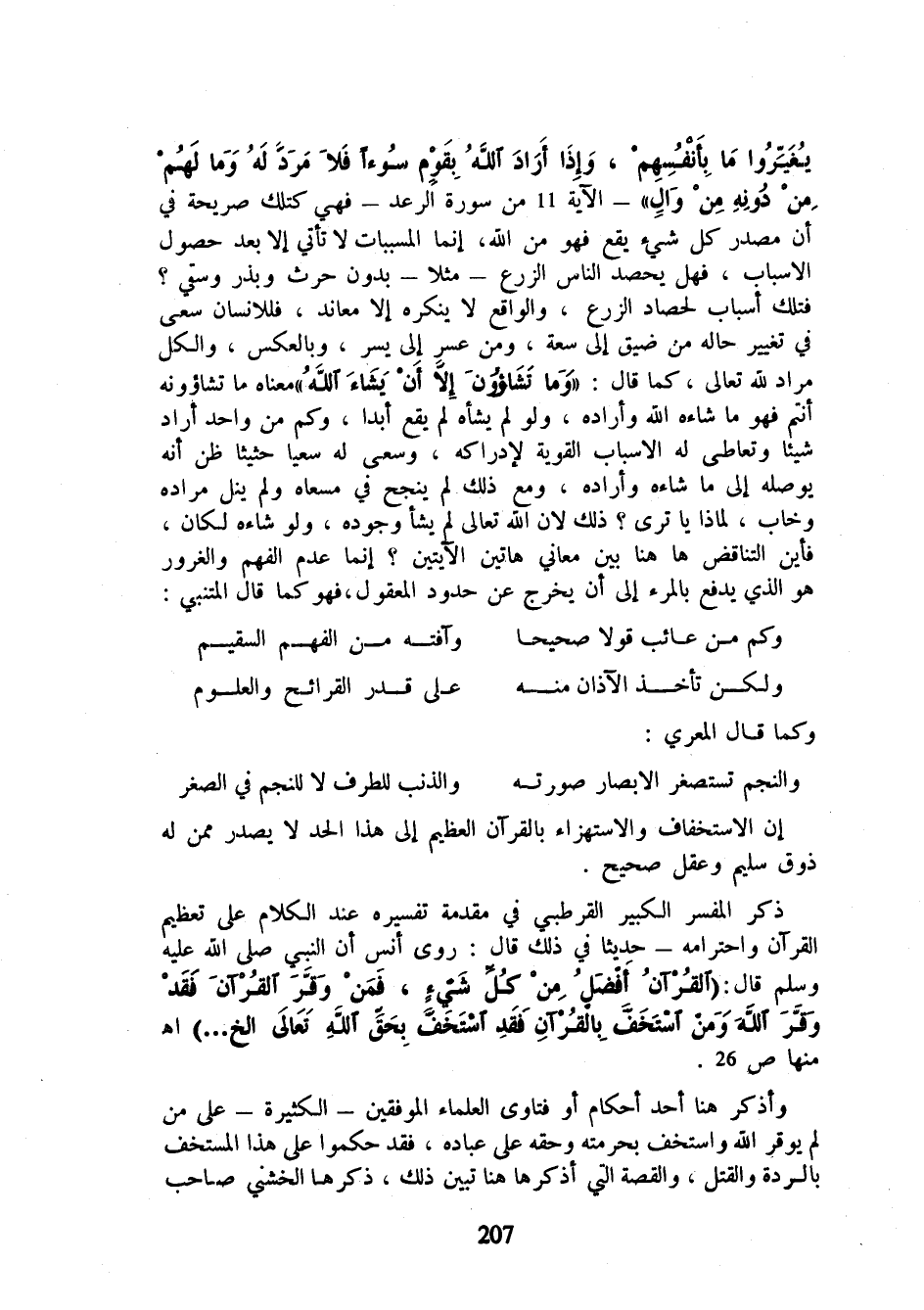 يُغَيِّرُوا مَا بِأَنْفُسِهِمْ وَإِذَا أَرَادَ اللَّهُ بِقَوْمٍ سُوءًا فَلَا مَرَدَّ لَهُ وَمَا لَهُمْ مِنْ دُونِهِ مِنْ وَالٍ} - الآية 11 من سورة الرعد - فهي كتلك صريحة في أن مصدر كل شيء يقع فهو من الله، إنما المسببات لا تأتي إلا بعد حصول الأسباب، فهل يحصد الناس الزرع - مثلا - بدون حرث وبذر وسقي؟