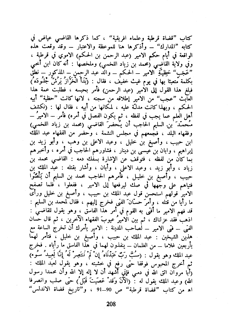 كتاب "قضاة قرطبة وعلماء افريقية"، كما ذكرها القاضي عياض في كتابه "المدارك" - وأذكرها هنا للموعظة والاعتبار - وقد وقعت هذه الواقعة في أيام حكم الأمير (عبد الرحمن بن الحكم) الأموي في قرطبة، وفي ولاية القاضي (محمد بن زياد اللخمي) وملخصها: أنه كان ابن أخي "عجب" حظية الأمير - الحكم - والد عبد الرحمن - المذكور - نطق بكلمة متعبثا بها في يوم غيث خفيف، فقال: (بَدَأَ الْخَرَّازُ يَرُشُّ جُلُودَهُ) فبلغ هذا القول إلى الأمير (عبد الرحمن) فأمر بحبسه، فطلبت عمة هذا العابث "عجب" من الأمير إطلاقه من سجنه، لأنها كانت "حظية" أبيه الحكم، وبهذا كانت مدلة عليه، لمكانها من أبيه، فقال لها: (نكشف أهل العلم عما يجب في لفظه، ثم يكون الفصل في أمره) فأمر - الأمير - محمد بن السليم الحاجب أن يحضر القاضي (محمد بن زياد اللخمي) وفقهاء البلد، فجمعهم في مجلس النشمة، وحضر من الفقهاء عبد الملك ابن حبيب، وأصبغ بن خليل، وعبد الأعلى بن وهب، وأبو زيد بن إبراهيم، وأبان بن عيسى بن دينار، فشاورهم الحاجب في أمره، وأخبرهم بما كان من لفظه، فتوقف عن الإشارة بسفك دمه: القاضي محمد بن زياد، وأبو زيد، وعبد الأعلى، وأبان، وأشار بقتله: عبد الملك بن حبيب، وأصبغ بن خليل، فأمرهم الحاجب محمد بن السليم أن ينصوا فتياهم على وجهها في صك ليرفعها إلى الأمير، ففعلوا، فلما تصفح الأمير قولهم استحسن قول عبد الملك بن حبيب، وأصبغ بن خليل ورأى ما رأيا من قتله، وأمر حسان الفتى فخرج إليهم، فقال لمحمد بن السليم: قد فهم الأمير ما أفتى به القوم في أمر هذا الفاسق، وهو يقول للقاضي: اذهب فقد عزلناك، ثم بين الأمير عيوب الفقهاء الآخرين، ثم قال حسان الفتى - فتى الأمير - لصاحب المدينة: الأمير يأمرك أن تخرج الساعة مع هذين الشيخين: عبد الملك بن حبيب، وأصبغ بن خليل، فتأمر لهما بأربعين غلاما - من الغلمان - ينفذون لهما في هذا الفاسق ما رأياه. فخرج عبد الملك وهو يقول: (سب رب عبدناه إن لم ننتصر له إنا لعبيد سوء) ثم أخرج المحبوس فوقفا حتى رفع في خشبه، وهو يقول لعبد الملك: (أبا مروان اتق الله في دمي فإني أشهد أن لا إله إلا الله وأن محمدا رسول الله) وعبد الملك يقول له: {آلْآنَ وَقَدْ عَصَيْتَ قَبْلُ} حتى صلب وانصرفا اهـ. من كتاب "قضاة قرطبة" ص 90 - 91، و"تاريخ قضاة الأندلس"