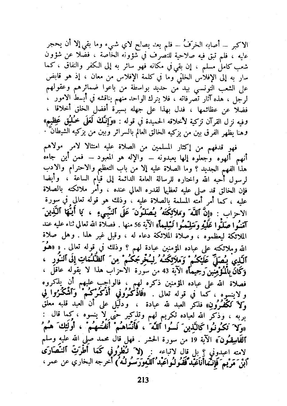 فهو قد فهم من إكثار المسلمين من الصلاة عليه امتثالا لأمر مولاهم أنهم ألهوه وجعلوه إلها يعبدونه - والإله هو المعبود - فمن أين جاءه هذا الفهم الجديد؟ وما الصلاة عليه إلا من باب التعظيم والاحترام والأدب لرسول أحبه الله واختاره للرسالة العامة الدائمة إلى قيام الساعة، وأيضا فإن الخالق قد صلى عليه تعظيما لقدره العالي عنده، وأمر ملائكته بالصلاة عليه، كما أمر أمته المسلمة بالصلاة عليه، وذلك هو قوله تعالى في سورة الأحزاب: {إِنَّ اللَّهَ وَمَلَائِكَتَهُ يُصَلُّونَ عَلَى النَّبِيِّ يَا أَيُّهَا الَّذِينَ آمَنُوا صَلُّوا عَلَيْهِ وَسَلِّمُوا تَسْلِيمًا} الآية 56 منها. فصلاة الله تعالى ثناء عليه عند الملائكة ليعظموه، وصلاة الملائكة دعاء له، وقيل غير هذا. وهل صلاة الله وملائكته على عباده المؤمنين عبادة لهم؟ وذلك في قوله تعالى: {هُوَ الَّذِي يُصَلِّي عَلَيْكُمْ وَمَلَائِكَتُهُ لِيُخْرِجَكُمْ مِنَ الظُّلُمَاتِ إِلَى النُّورِ وَكَانَ بِالْمُؤْمِنِينَ رَحِيمًا} الآية 43 من سورة الأحزاب هذا لا يقوله عاقل، فصلاة الله على عباده المؤمنين ذكره لهم، فالواجب عليهم أن يذكروه ولا ينسوه، كما في قوله تعالى: {فَاذْكُرُونِي أَذْكُرْكُمْ وَاشْكُرُوا لِي وَلَا تَكْفُرُونِ} فذكر العبد لله عبادة، ودليل على أن العبد قلبه معلق بربه، وذكر الله لعباده تكريم لهم وتذكير حتى لا ينسوه، كما قال: {وَلَا تَكُونُوا كَالَّذِينَ نَسُوا اللَّهَ فَأَنْسَاهُمْ أَنْفُسَهُمْ أُولَئِكَ هُمُ الْفَاسِقُونَ} الآية 19 من سورة الحشر. فهل قال محمد صلى الله عليه وسلم لأمته اعبدوني؟ بل قال لأتباعه: ((لا تطروني كما أطرت النصارى ابن مريم فإنما أنا عبد قولوا عبد الله ورسوله)) أخرجه البخاري عن عمر،