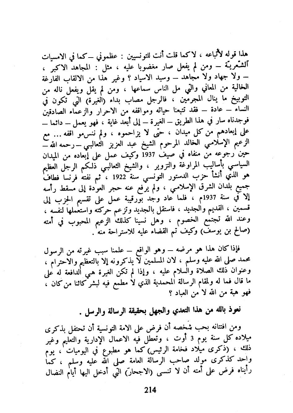 هذا قوله لأتباعه، لا كما قلت أنت للتونسيين: عظموني - كما في الأمسيات الشعرية - ومن لم يفعل صار مغضوبا عليه، مثل: المجاهد الأكبر، - ولا جهاد ولا مجاهد - وسيد الأسياد؟ وغير هذا من الألقاب الفارغة الخالية من المعاني والتي مل الناس سماعها، ومن لم يقل ويفعل ناله من التوبيخ ما ينال المجرمين، فالرجل مصاب بداء (الغيرة) التي تكون في النساء - عادة - فقد تتبعنا حياته ومواقفه من الأحرار والزعماء الصادقين فوجدناه سار في هذا الطريق - الغيرة - إلى أبعد غاية، فهو يعمل - دائما - على إبعادهم من كل ميدان، حتى لا يزاحموه، ولم ننس مواقفه ... مع الزعيم الإسلامي الخالد المرحوم الشيخ عبد العزيز الثعالبي - رحمه الله - حين رجوعه من منفاه في صيف 1937 وكيف عمل على إبعاده من الميدان السياسي بأساليب المراوغة والتزوير، والشيخ الثعالبي ذلكم الرجل العظيم هو الذي أنشأ حزب الدستور التونسي سنة 1922، ثم نفته فرنسا فطاف جميع بلدان الشرق الإسلامي، ولم يرفع عنه حجر العودة إلى مسقط رأسه إلا في سنة 1937م، فلما عاد وجد بورقيبة عمل على تقسيم الحزب إلى قسمين، القديم والجديد، فاستقل بالجديد وتزعم حركته واستعملها لنفسه، وعند الله تجتمع الخصوم، وهل نسينا كذلك الزعيم المحبوب في أمته (صالح بن يوسف) وكيف تم القضاء عليه للاستراحة منه.