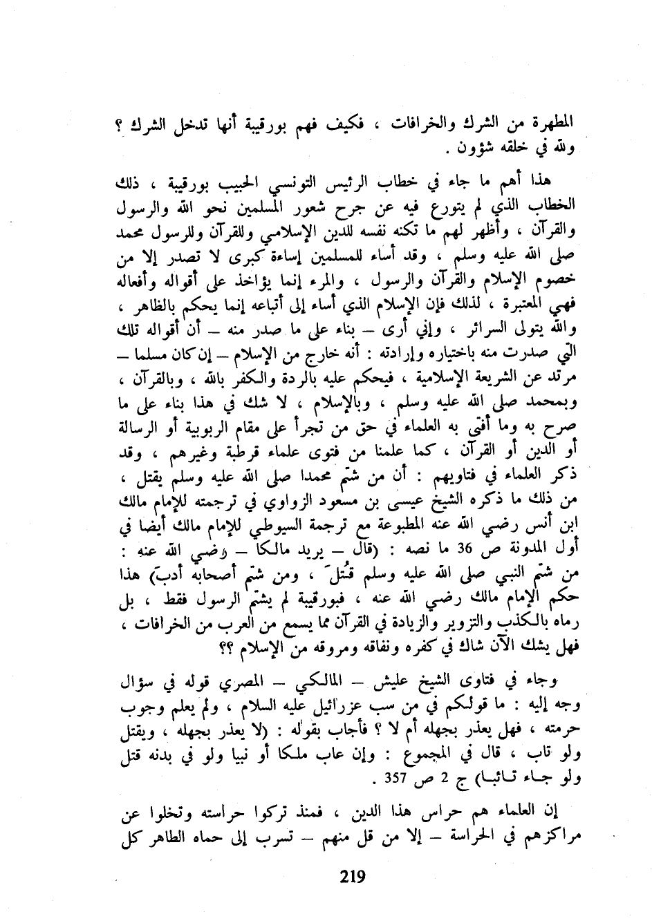 هذا أهم ما جاء في خطاب الرئيس التونسي الحبيب بورقيبة، ذلك الخطاب الذي لم يتورع فيه عن جرح شعور المسلمين نحو الله والرسول والقرآن، وأظهر لهم ما تكنه نفسه للدين الإسلامي وللقرآن وللرسول محمد صلى الله عليه وسلم، وقد أساء للمسلمين إساءة كبرى لا تصدر إلا من خصوم الإسلام والقرآن والرسول، والمرء إنما يؤاخذ على أقواله وأفعاله فهي المعتبرة، لذلك فإن الإسلام الذي أساء إلى أتباعه إنما يحكم بالظاهر، والله يتولى السرائر، وإني أرى - بناء على ما صدر منه - أن أقواله تلك التي صدرت منه باختياره وإرادته، أنه خارج من الإسلام - إن كان مسلما - مرتد عن الشريعة الإسلامية، فيحكم عليه بالردة والكفر بالله، وبالقرآن، وبمحمد صلى الله عليه وسلم، وبالإسلام، لا شك في هذا بناء على ما صرح به وما أفتى به العلماء في حق من تجرأ على مقام الربوبية أو الرسالة أو الدين أو القرآن، كما علمنا من فتوى علماء قرطبة وغيرهم، وقد ذكر العلماء في فتاويهم: أن من شتم محمدا صلى الله عليه وسلم يقتل، من ذلك ما ذكره الشيخ عيسى بن مسعود الزواوي في ترجمته للإمام مالك ابن أنس رضي الله عنه المطبوعة مع ترجمة السيوطي للإمام مالك أيضا في أول المدونة ص 36 ما نصه: (قال - يريد مالكا - رضي الله عنه: