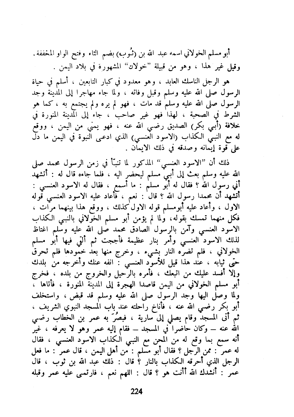أتشهد أن محمدا رسول الله في قال: نعم، فأعاد عليه الأسود النسي قوله الأول، وأعاد عليه أبو مسلم قوله الأول كذلك، ووقع هذا بينهما مرات، فكل منهما تمسك بقوله، ولما لم يؤمن أبو مسلم الخولاني بالنبي الكذاب الأسود العنسي وآمن بالرسول الصادق محمد صلى الله عليه وسلم اغتاظ لذلك الأسود العنسي وأمر بنار عظيمة فأججت ثم ألقي فيها أبو مسلم الخولاني، فلم تضره النار بشيء، وخرج منها بعد خمودها فلم تحرق حتى ثيابه، عند هذا قيل للأسود العنسي: انفه عنك وأخرجه من بلدك وإلا أفسد عليك من اتبعك، فأمره بالرحيل والخروج من بلده، فخرج أبو مسلم الخولاني من اليمن قاصدا الهجرة إلى المدينة المنورة، فأتاها، ولما وصل إليها وجد الرسول صلى الله عليه وسلم قد قبض، واستخلف أبو بكر رضي الله عنه، فأناخ راحلته عند باب المسجد النبوي الشريف، ثم أتى المسجد وقام يصلي إلى سارية، فبصر به عمر بن الخطاب رضي الله عنه - وكان حاضرا في المسجد - فقام إليه عمر وهو لا يعرفه، غير أنه سمع بما وقع له من المحن مع النبي الكذاب الاسود العنسي، فقال له عمر: ممن الرجل؟ فقال أبو مسلم: من أهل اليمن، قال عمر، ما فعل الرجل الذي أحرقه الكذاب بالنار؟ قال: ذلك عبد الله بن ثوب، قال عمر: أنشدك الله أأنت هو؟ قال: اللهم نعم، فارتمى عليه عمر وقبله