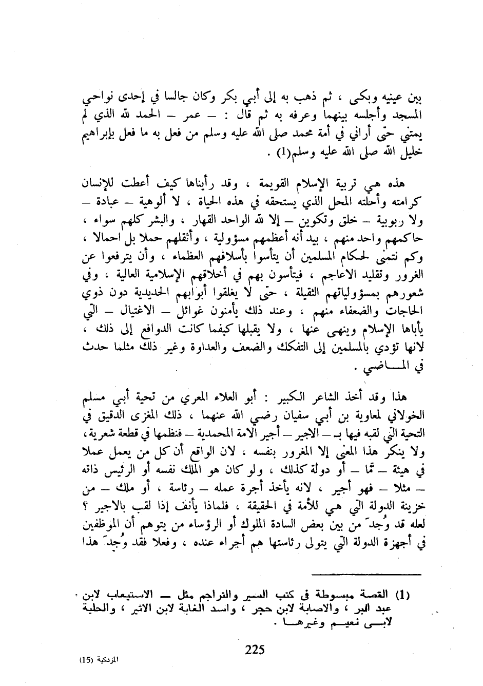 هذه هي تربية الإسلام القويمة، وقد رأيناها كيف أعطت للإنسان كرامته وأحلته المحل الذي يستحقه في هذه الحياة، لا ألوهية - عبادة - ولا ربوبية - خلق وتكوين - إلا لله الواحد القهار، والبشر كلهم سواء، حاكمهم واحد منهم، بيد أنه أعظمهم مسؤولية، وأثقلهم حملا بل أحمالا، وكم نتمنى لحكام المسلمين أن يتأسوا بأسلافهم العظماء، وأن يترفعوا عن الغرور وتقليد الأعاجم، فيتأسون بهم في أخلاقهم الإسلامية العالية، وفي شعورهم بمسؤولياتهم الثقيلة، حتى لا يغلقوا أبوابهم الحديدية دون ذوي الحاجات والضعفاء منهم، وعند ذلك يأمنون غوائل - الاغتيال - التي يأباها الإسلام وي! هي عنها، ولا يقبلها كيفما كانت الدوافع إلى ذلك، لأنها تؤدي بالمسلمين إلى التفكك والضعف والعداوة وغير ذلك مثلما حدث في الماضي.