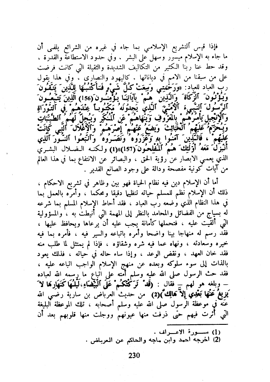 أما أن الإسلام دين فيه نظام الحياة فهو بين وظاهر في تشريع الأحكام، ذلك أن الإسلام نظم للمسلم حياته تنظيما دقيقا ومحكما، وأمره بالعمل بما في هذال النظام الذي وضعه رب العباد، فقد أحاط الإسلام المسلم بما شرعه له بسياج من الفضائل والمحامد بالنظر إلى المهمة التي أنيطت به، والمسؤولية التي ألقيت عليه، فتحملها كأمانة يجب عليه أن يرعاها ويحافظ عليها، فقد رسم له منهاجا بينا واضحا وأمره باتباعه والسير فيه، فأمره بما فيه خيره وسعادته، ونهاه عما فيه شره وشقاؤه، فإذا لم يمتثل لما طلب منه فقد خان العهد، ونقض الوعد، وإذا ساء حاله في حياته، فذلك يعود بالذات إلى سوء سلوكه وبعده عن منهج الإسلام الواجب اتباعه عليه، فقد حث الرسول صلى الله عليه وسلم أمته على اتباع ما رسمه الله لعباده - وبلغه هو لهم - فقال: ((قد تركتكم على البيضاء، ليلها كنهارها لا يزيغ عنها بعدي إلا هالك)) (¬2) من حديث العرباض بن سارية رضي الله عنه في موعظة الرسول صلى الله عليه وسلم أصحابه، تلك الموعظة البليغة التي أثرت فيهم حتى ذرفت منها عيونهم ووجلت منها قلوبهم بعد أن