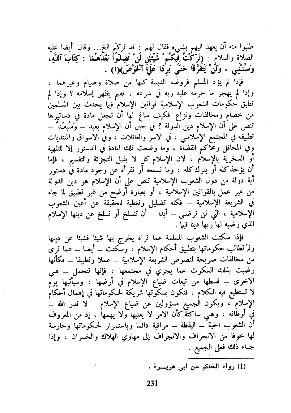 فإذا لم يؤد المسلم فروضه الدينية كلها من صلاة وصيام وغيرهما، وإذا لم يهجر ما حرمه عليه ربه في شرعه، ففيم يظهر إسلامه؟ وإذا لم تطبق حكومات الشعوب الإسلامية قوانين الإسلام فيما يحدث بين المسلمين من خصام ومخالفات ونزاع فكيف ساغ لها أن تجعل مادة في دساتيرها تنص على أن الإسلام دين الدولة؟ في حين أن الإسلام بعيد - ومبعد - تطبيقه في المجتمع الإسلامي، في الأسر والعائلات، وفي الأسواق والمنتديات وفي المحافل ومحاكم القضاة، وما وضعت تلك المادة في الدستور إلا للتلهية أو السخرية بالإسلام، لأن الإسلام كل لا يقبل التجزئة والتقسيم، فإما أن يؤخذ كله أو يترك كله. وما نسمعه أو نقرأه عن وجود مادة في دستور أية دولة من دول الشعوب الإسلامية تنص على أن الإسلام هو دين الدولة من غير عمل بالقوانين الإسلامية. أو بعبارة أوضح من غير تطبيق لما جاء في الشريعة الإسلامية - فكله تضليل وتغطية لا حقيقة عن أعين الشعوب الإسلامية، التي لن ترضى - أبدا - أن تنسلخ أو تسلخ عن دينها الإسلام الذي رضيه لها ربها دينا قيما.