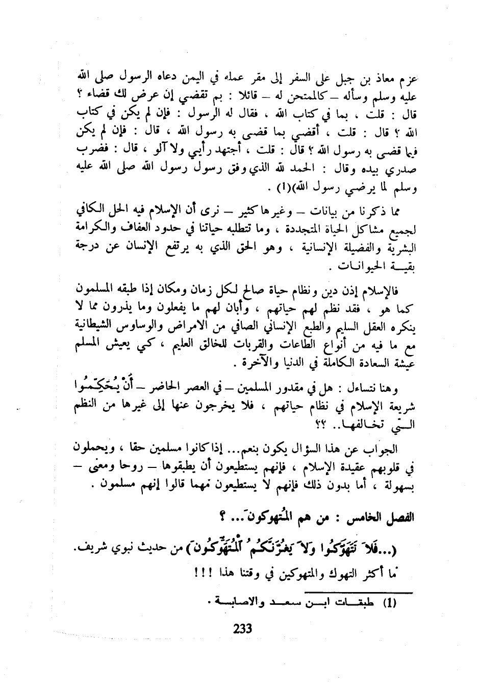 وهنا نتساءل: هل في مقدور المسلمين - في العصر الحاضر - أن يحكموا شريعة الإسلام في نظام حياتهم، فلا يخرجون عنها إلى غيرها من النظم التي تخالفها .. ؟؟