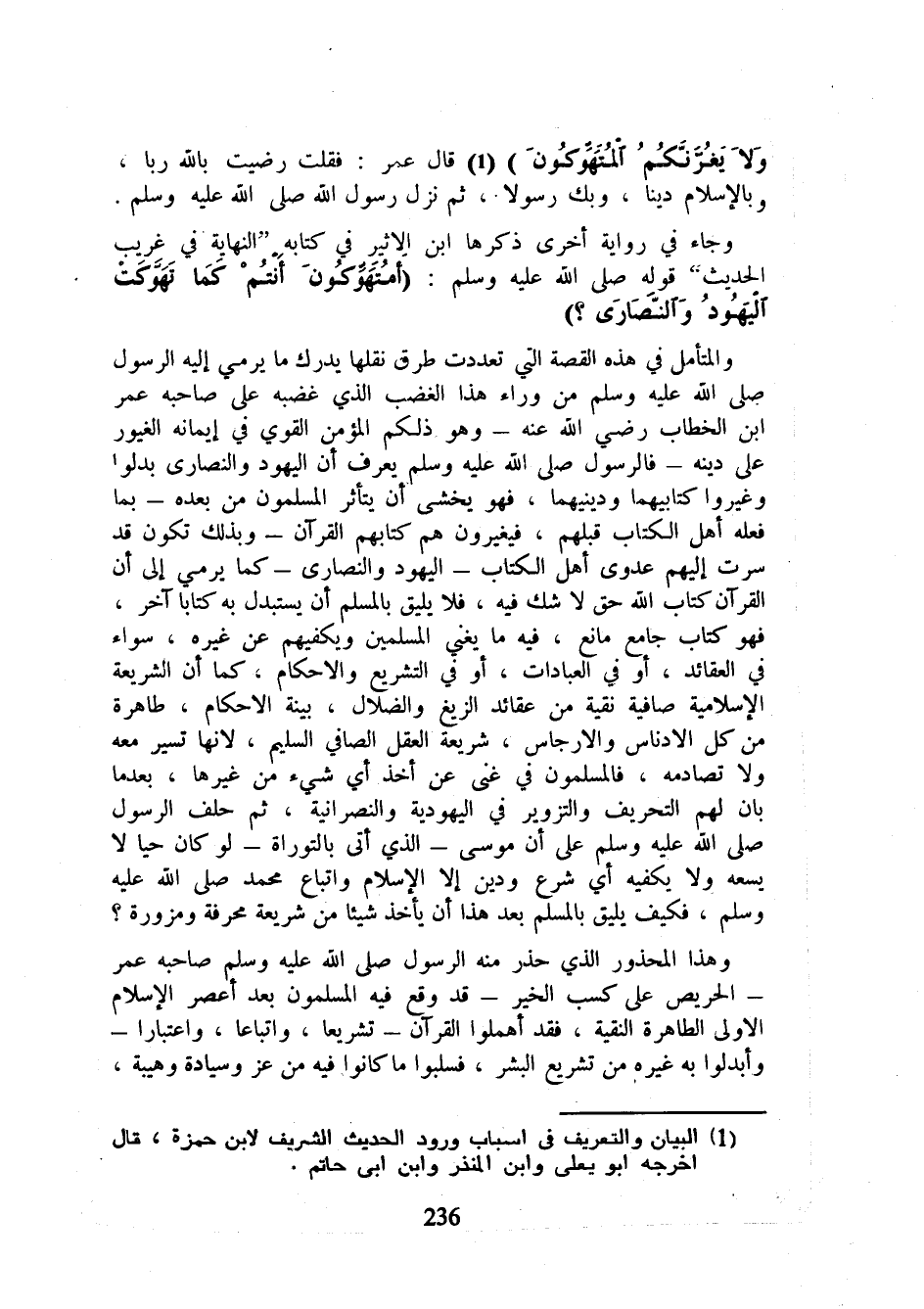 والمتأمل في هذه القصة التي تعددت طرق نقلها يدرك ما يرمي إليه الرسول صلى الله عليه وسلم من وراء هذا الغضب الذي غضبه على صاحبه عمر ابن الخطاب رضي الله عنه - وهو ذلكم المؤمن القوى في إيمانه الغيور على دينه - فالرسول صلى الله عليه وسلم يعرف أن اليهود والنصارى بدلوا وغيروا كتابيهما ودينيهما، فهو يخشى أن يتأثر المسلمون من بعده - بما فعله أهل الكتاب قبلهم، فيغيرون هم كتابهم القرآن - وبذلك تكون قد سرت إليهم عدوى أهل الكتاب - اليهود والنصارى - كما يرمي إلى أن القرآن كتاب الله حق لا شك فيه، فلا يليق بالمسلم أن يستبدل به كتابا آخر، فهو كتاب جامع مانع، فيه ما يغني المسلمين ويكفيهم عن غيره، سواء في العقائد، أو في العبادات، أو في التشريع والأحكام، كما أن الشريعة الإسلامية صافية نقية من عقائد الزيغ والضلال، بينة الأحكام، طاهرة من كل الأدناس والأرجاس، شريعة العقل الصافي السليم، لأنها تسير معه ولا تصادمه، فالمسلمون في غنى عن أخذ أي شيء من غيرها، بعدما بان لهم التحريف والتزوير في اليهودية والنصرانية، ثم حلف الرسول صلى الله عليه وسلم على أن موسى - الذي أتى بالتوراة - لو كان حيا لا يسعه ولا يكفيه أي شرع ودين إلا الإسلام واتباع محمد صلى الله عليه وسلم، فكيف يليق بالمسلم بعد هذا أن يأخذ شيئا من شريعة محرفة ومزورة؟ وهذا المحذور الذي حذر منه الرسول صلى الله عليه وسلم صاحبه عمر - الحريص على كسب الخير - قد وقع فيه المسلمون بعد أعصر الإسلام الأولى الطاهرة النقية، فقد أهملوا القرآن - تشريعا، واتباعا، واعتبارا - وأبدلوا به غيره من تشريع البشر، فسلبوا ما كانوا فيه من عز وسيادة وهيبة،