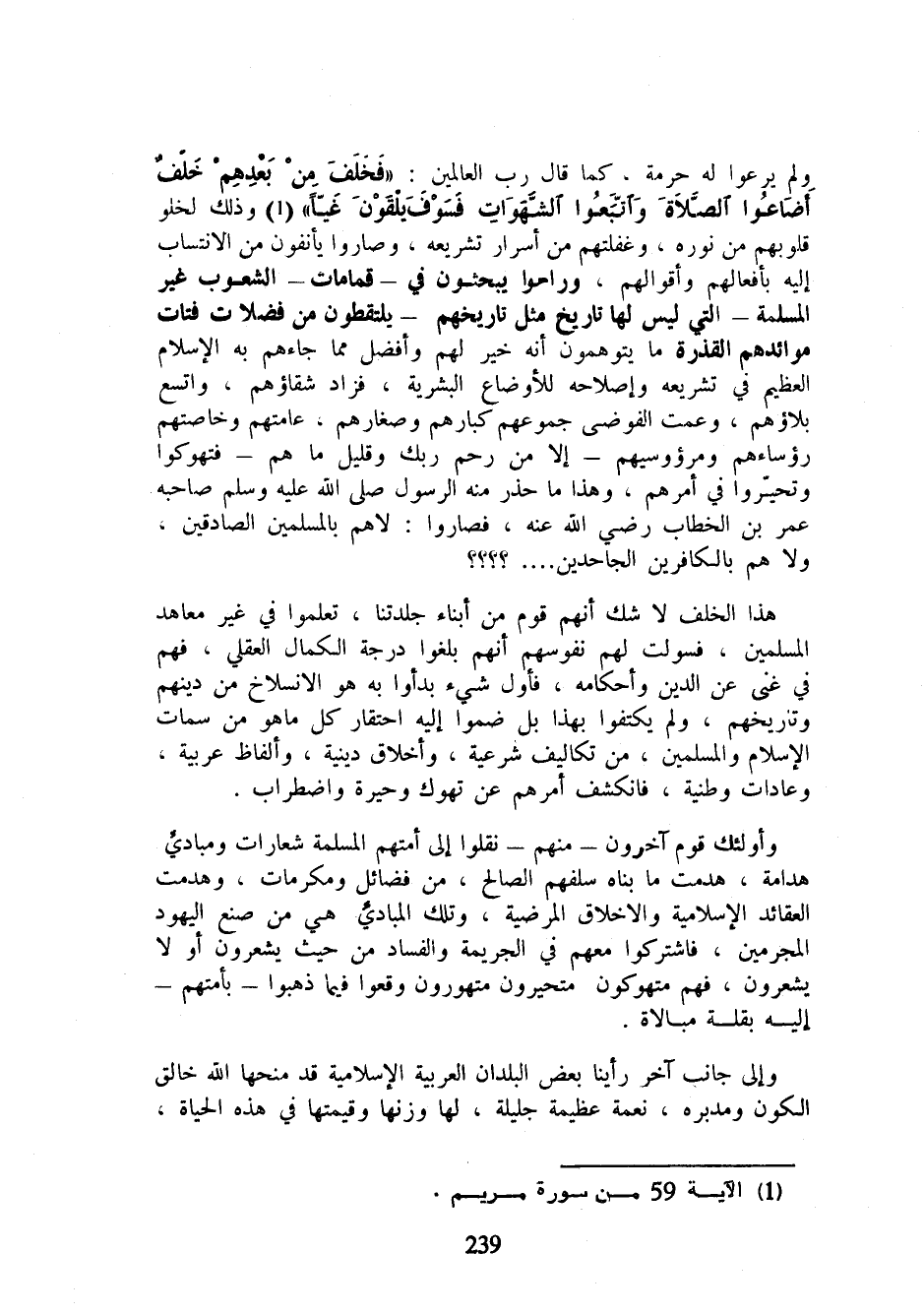 ولم يرعوا له حرمة، كما قال رب العالمين: {فَخَلَفَ مِنْ بَعْدِهِمْ خَلْفٌ أَضَاعُوا الصَّلَاةَ وَاتَّبَعُوا الشَّهَوَاتِ فَسَوْفَ يَلْقَوْنَ غَيًّا} (¬1) وذلك لخلو قلوبهم من نوره، وغفلتهم من أسرار تشريعه، وصاروا يأنفون من الانتساب إليه بأفعالهم وأقوالهم، وراحوا يبحثون في - قمامات - الشعوب غير المسلمة - التي ليس لها تاريخ مثل تاريخهم - يلقطون من فضلات فتات موائدهم القذرة ما يتوهمون أنه خير لهم وأفضل مما جاءهم به الإسلام العظيم في تشريعه وإصلاحه للأوضاع البشرية، فزاد شقاؤهم، واتسع بلاؤهم، وعمت الفوضى جموعهم كبارهم وصغارهم، عامتهم وخاصتهم رؤساءهم ومرؤوسيهم - إلا من رحم ربك وقليل ما هم - فتهوكوا وتحيروا في أمرهم، وهذا ما حذر منه الرسول صلى الله عليه وسلم صاجه عمر بن الخطاب رضي الله عنه، فصاروا: لا هم بالمسلمين الصادقين، ولا هم بالكافرين الجاحدين .... ؟؟؟؟