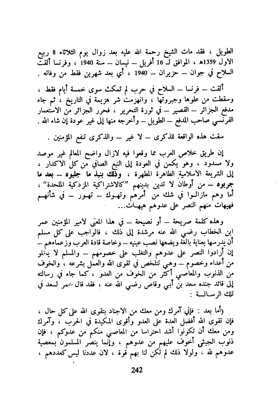وهذه كلمة صريحة - أو نصيحة - في هذا المعنى لأمير المؤمنين عمر ابن الخطاب رضي الله عنه مرشدة إلى ذلك، فالواجب على كل مسلم أن يدرسها بعناية بالغة ويضعها نصب عينيه - وخاصة قادة العرب وزعماءهم - إن أرادوا النصر على عدوهم والتغلب على خصومهم - والمسلم لا يخلو من أعداء وخصوم - وهي تتلخص في تقوى الله والعمل بشرعه، والخوف من الذنوب والمعاصي أكثر من الخوف من العدو، كما جاء في رسالته إلى قائد جنده سعد بن أبي وقاص رضي الله عنه، فقد قال عمر لسعد في تلك الرسالة: