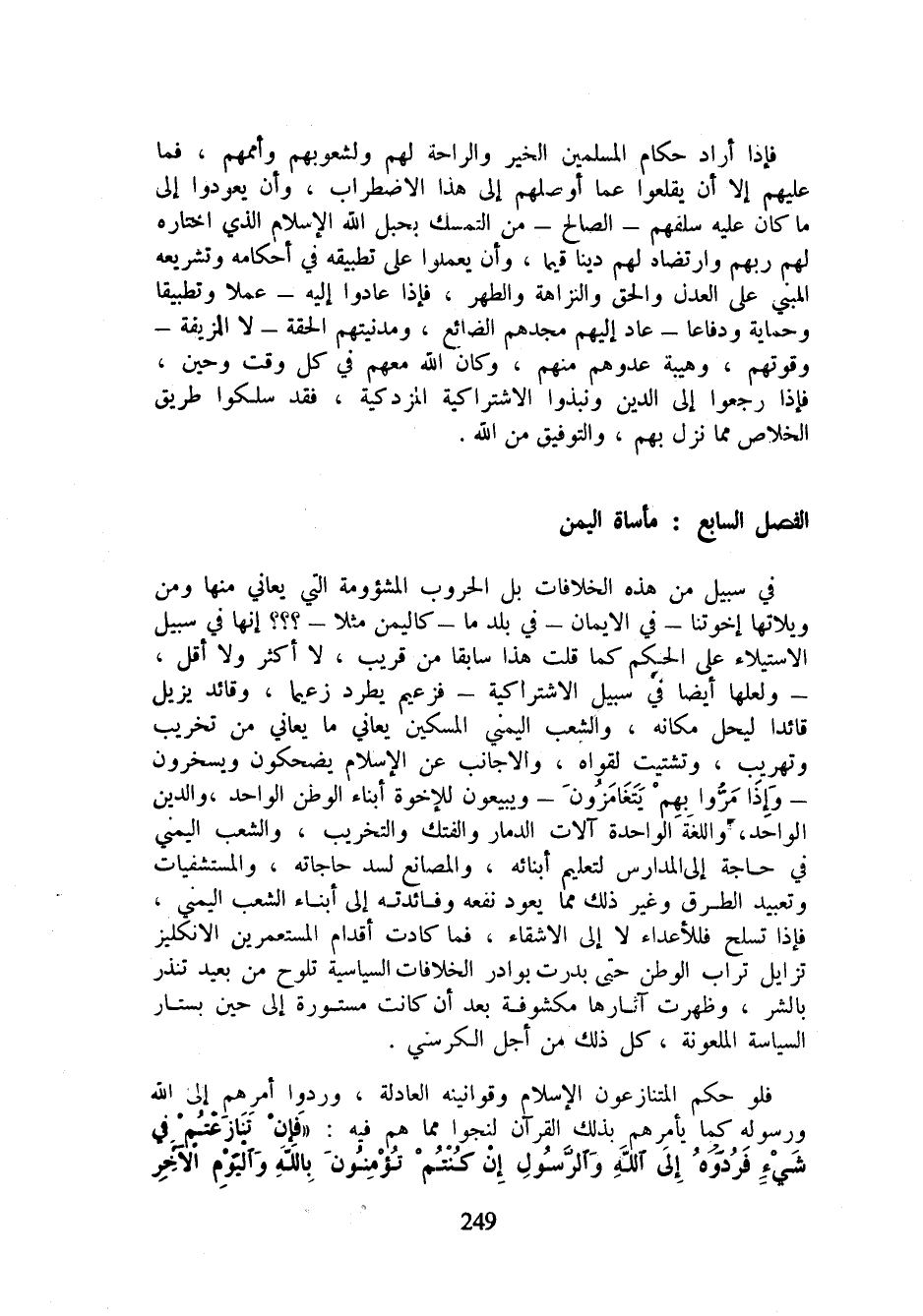في سبيل من هذه الخلافات بل الحروب المشؤومة التي يعاني منها ومن ويلاتها إخوتنا - في الإيمان - في بلد ما - كاليمن مثلا -؟؟؟ إنها في سبيل الاستيلاء على الحكم كما قلت هذا سابقا من قريب، لا أكثر ولا أقل، - ولعلها أيضا في سبيل الاشتراكية - فزعيم يطرد زعيما، وقائد يزيل قائدا ليحل مكانه، والشعب اليمني المسكين يعاني ما يعاني من تخريب وتهريب، وتشتيت لقواه، والأجانب عن الإسلام يضحكون ويسخرون - {وَإِذَا مَرُّوا بِهِمْ يَتَغَامَزُونَ} - ويبيعون للإخوة أبناء الوطن الواحد، والدين الواحد، واللغة الواحدة آلات الدمار والفتك والتخريب، والشعب اليمني في حاجة إلى المدارس لتعليم أبنائه، والمصانع لسد حاجاته، والمستشفيات وتعبيد الطرق وغير ذلك مما يعود نفعه وفائدته إلى أبناء الشعب اليمني، فإذا تسلح فللأعداء لا إلى الأشقاء، فما كادت أقدام المستعمرين الإنكليز تزايل تراب الوطن حتى بدرت بوادر الخلافات السياسية تلوح من بعيد تنذر بالشر، وظهرت آثارها مكشوفة بعد أن كانت مستورة إلى حين بستار السياسة الملعونة، كل ذلك من أجل الكرسي.