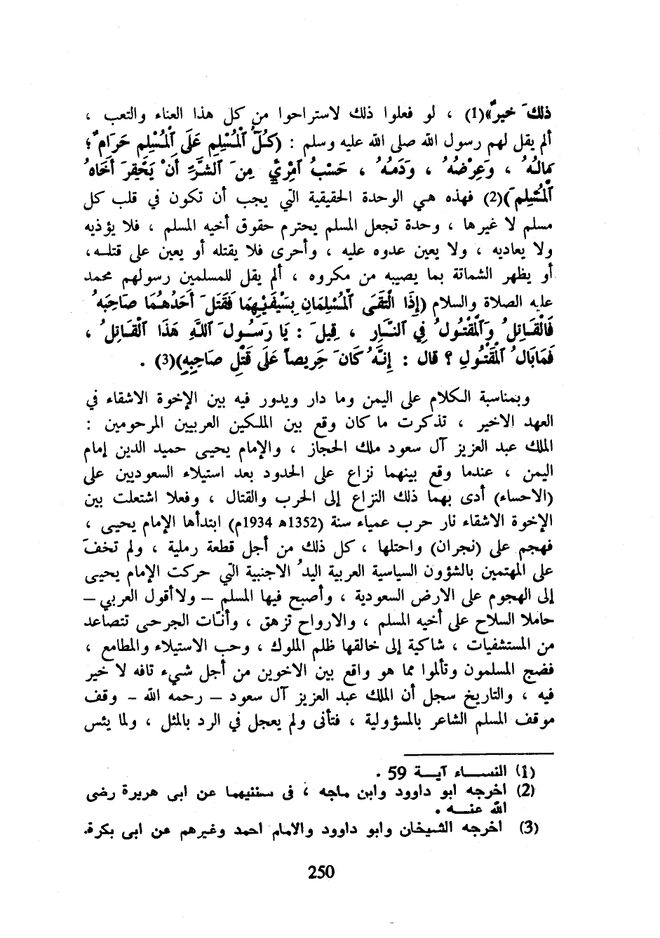 وبمناسبة الكلام على اليمن وما دار ويدور فيه بين الإخوة الأشقاء في العهد الأخير، تذكرت ما كان وقع بين الملكين العربيين المرحومين: الملك عبد العزيز آل سعود ملك الحجاز، والإمام يحيى حميد الدين إمام اليمن، عندما وقع بينهما نزاع على الحدود بعد استيلاء السعوديين على (الأحساء) أدى بهما ذلك النزاع إلى الحرب والقتال، وفعلا اشتعلت بين الإخوة الأشقاء نار حرب عمياء سنة (1352 هـ 1934 م) ابتدأها الإمام يحيى، فهجم على (نجران) واحتلها، كل ذلك من أجل قطعة رملية، ولم تخف عل المهتمين بالشؤون السياسية العربية اليد الأجنبية التي حركت الإمام يحيى إلى الهجوم على الأرض السعودية، وأصبح فيها المسلم - ولا أقول العربي - حاملا السلاح على أخيه المسلم، والأرواح تزهق، وأنات الجرحى تتصاعد من المستشفيات، شاكية إلى خالقها ظلم الملوك، وحب الاستيلاء والمطامع، فضج المسلمون وتألموا مما هو واقع بين الأخوين من أجل شيء تافه لا خير فيه، والتاريخ سجل أن الملك عبد العزيز آل سعود - رحمه الله - وقف موقف المسلم الشاعر بالمسؤولية، فتأنى ولم يعجل في الرد بالمثل، ولما يئس