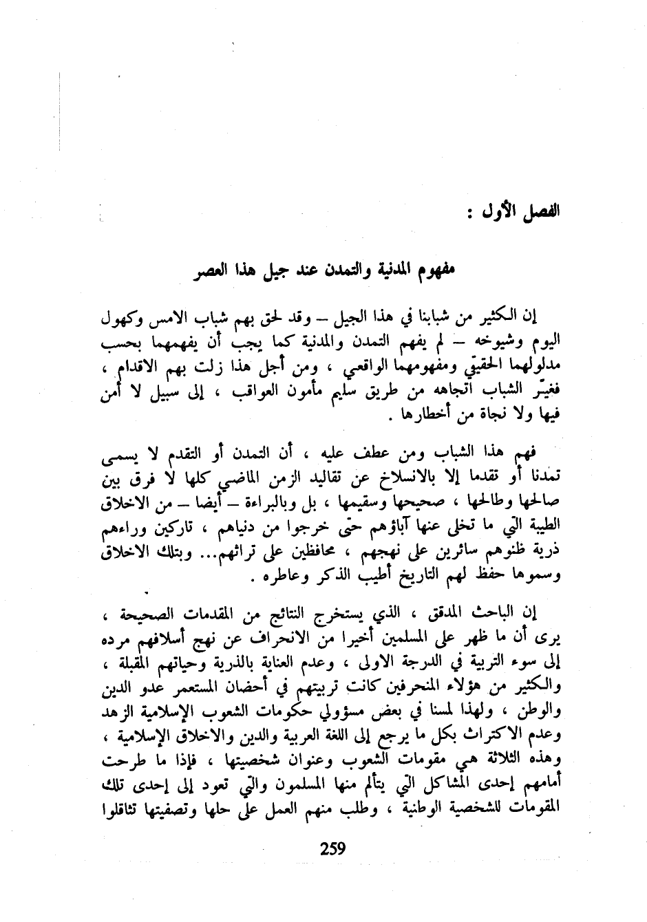 إن الكثير من شبابنا في هذا الجيل - وقد لحق بهم شباب الأمس وكهول اليوم وشيوخه - لم يفهم التمدن والمدنية كما يجب أن يفهمهما بحسب مدلولهما الحقيقي ومفهومهما الواقعي، ومن أجل هذا زلت بهم الأقدام، فغير الشباب اتجاهه من طريق سليم مأمون العواقب، إلى سبيل لا أمن فيها ولا نجاة من أخطارها.