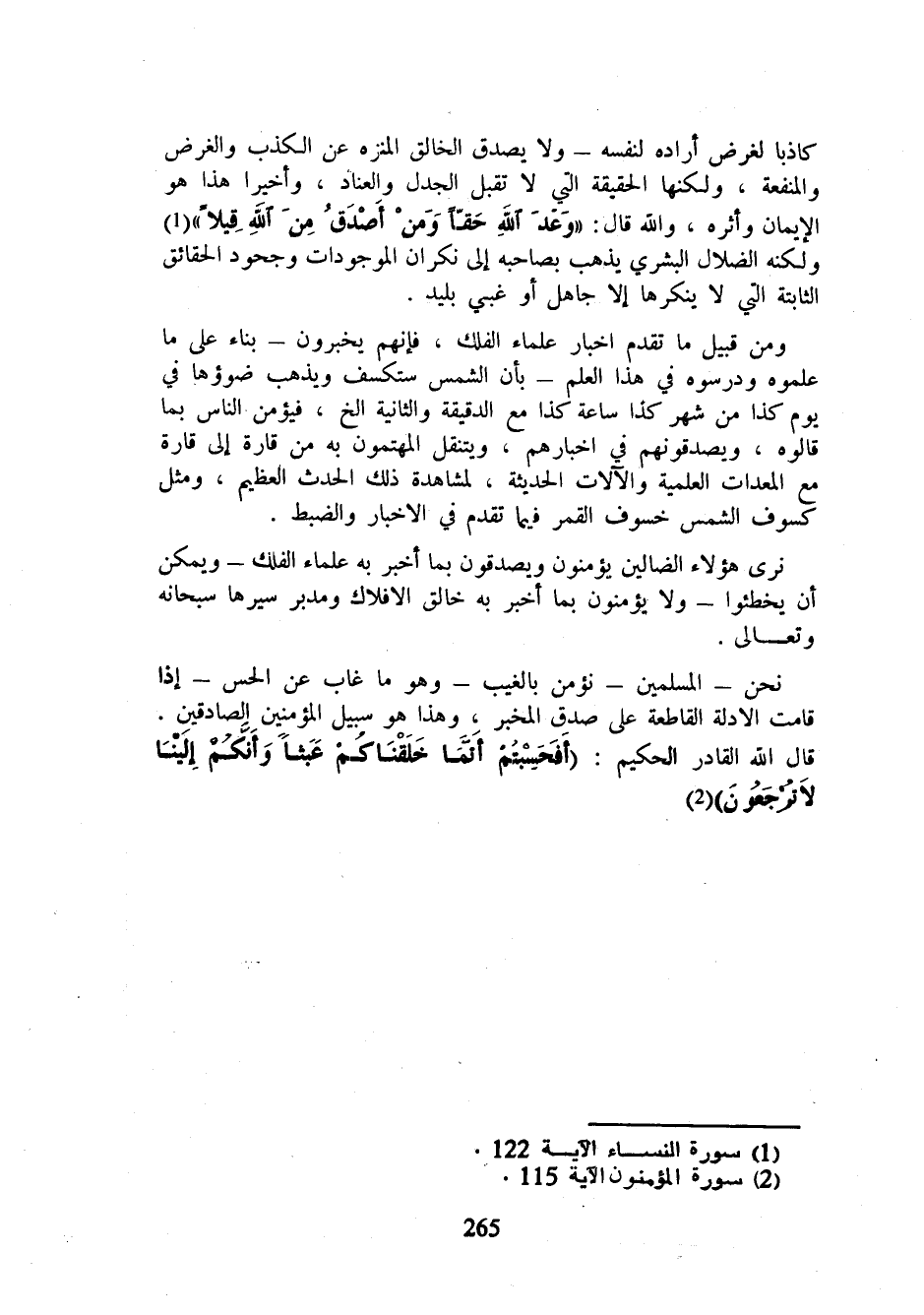 نرى هؤلاء الضالين يؤمنون ويصدقون بما أخبر به علماء الفلك - ويمكن أن يخطئوا - ولا يؤمنون بما أخبر به خالق الأفلاك ومدبر سيرها سبحانه وتعالى.