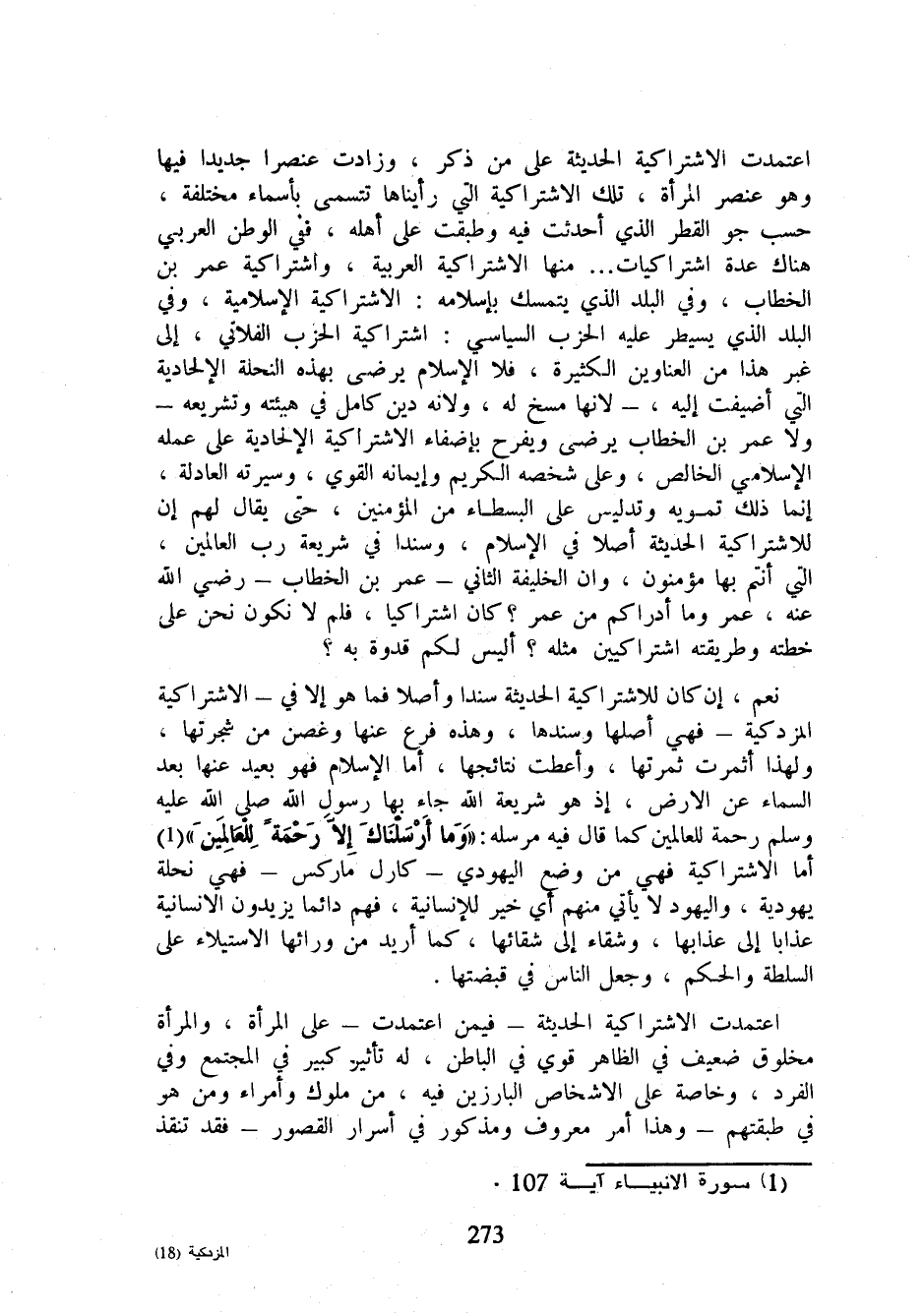 نعم، إن كان للاشتراكية الحديثة سندا وأصلا فما هو إلا في - الاشتراكية المزدكية - فهي أصلها وسندها، وهذه فرع عنها وغصن من شجرتها، ولهذا أثمرت ثمرتها، وأعطت نتائجها، أما الإسلام فهو بعيد عنها بعد السماء عن الأرض، إذ هو شريعة الله جاء لها رسول الله صلى الله عليه رحمة للعالمين كما قال فيه مرسله: {وَمَا أَرْسَلْنَاكَ إِلَّا رَحْمَةً لِلْعَالَمِينَ} (¬1) أما الاشتراكية فهي من وضع اليهودي - كارل ماركس - فهي نحلة يهودية: واليهود لا يأتي منهم أي خير للإنسانية، فهم دائما يزيدون الإنسانية عذابا إلى عذابها، وشقاء إلى شقائها، كما أريد من ورائها الاستيلاء على السلطة والحكم، وجعل الناس في قبضتها.
