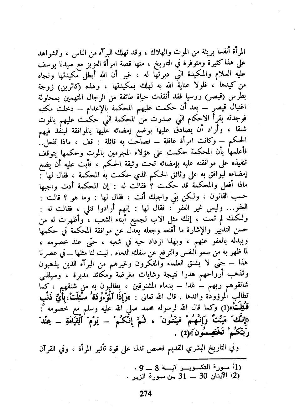 المرأة أنفسا بريئة من الموت والهلاك، وقد تهلك البرآء من الناس، والشواهد على هذا كثيرة ومتوفرة في التاريخ، منها قصة امرأة العزيز مع سيدنا يوسف عليه السلام والمكيدة التي دبرتها له، غير أن الله أبطل مكيدتها ونجاه من كيدها، فلولا عناية الله به لهلك بمكيدتها، وهذه (كاترين) زوجة بطرس (قيصر) روسيا فقد أنقذت حياة طائفة من الرجال المتهمين بمحاولة اغتيال قيصر - بعد أن حكمت عليهم المحكمة بالإعدام - دخلت مكتبه فوجدته يقرأ الأحكام التي صدرت من المحكمة التي حكمت عليهم بالموت شنقا، وأراد أن يصادق عليها بوضع إمضائه عليها بالموافقة لينفذ فيهم الحكم - وكانت امرأة عاقلة - فصاحت به قائلة: قف، ماذا تفعل .. فأعلمها بأن المحكمة حكمت على هؤلاء المجرمين بالموت وحكمها يتوقف تنفيذه على موافقته عليه بإمضائه تحت وثيقة الحكم، فأبت عليه أن يضع إمضاءه ليوافق به على وثائق الحكم الذي حكمت به المحكمة، فقال لها: ماذا أفعل والمحكمة قد حكمت؟ فقالت له: إن المحكمة أدت واجبها حسب القانون، ولكن بقي واجبك أنت، فقال لها: وما هو؟ قالت: العفو ... وليس غير العفو، فقال لها: إنهم أرادوا قتلي، فقالت له: ولكنك لم تمت، إنك مثل الأب لجميع أبناء الشعب، وأظهرت له من حسن التدبير والإشارة ما أقنعه وجعله يعدل عن موافقة المحكمة في حكمها ويبدله بالعفو عنهم، وبهذا ازداد حبه في شعبه، حتى عند خصومه، لما ظهر به من سمو النفس والترفع عن سفك الدماء. ليت لنا مثلها - في عصرنا هذا - حتى لا يشنق العلماء والمفكرون وغيرهم من البرآء الذين يذهبون وتذهب أرواحهم هدرا نتيجة وشايات مغرضة ومكائد مدبرة، وسيلقى شانقوهم ربهم - غدا - بدماء المشنوقين، يطالبون به من شنقهم، بهما تطالب الموءودة وائدها. قال الله تعالى: {وَإِذَا الْمَوْءُودَةُ سُئِلَتْ * بِأَيِّ ذَنْبٍ قُتِلَتْ} (¬1) وكما قال الله لرسوله محمد صلى الله عليه وسلم مع خصومه: {إِنَّكَ مَيِّتٌ وَإِنَّهُمْ مَيِّتُونَ * ثُمَّ إِنَّكُمْ يَوْمَ الْقِيَامَةِ عِنْدَ رَبِّكُمْ تَخْتَصِمُونَ} (¬2).