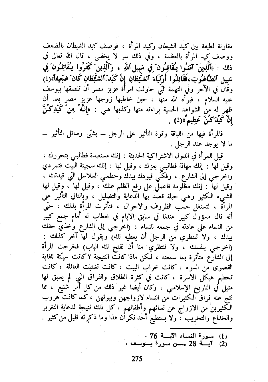 مقارنة لطيفة بين كيد الشيطان وكيد المرأة، فوصف كيد الشيطان بالضعف ووصف كيد المرأة بالعظمة، وفي ذلك سر لا يخفى، قال الله تعالى في ذلك: {الَّذِينَ آمَنُوا يُقَاتِلُونَ فِي سَبِيلِ اللَّهِ وَالَّذِينَ كَفَرُوا يُقَاتِلُونَ فِي سَبِيلِ الطَّاغُوتِ فَقَاتِلُوا أَوْلِيَاءَ الشَّيْطَانِ إِنَّ كَيْدَ الشَّيْطَانِ كَانَ ضَعِيفًا} (¬1) وقال في الآخر وفي التهمة التي حاولت امرأة عزيز مصر أن تلصقها بيوسف عليه السلام، فبرأه الله منها، حين خاطبها زوجها عزيز مصر بعد أن ظهر له من الشواهد الحسية براءته منها وكذبها هي: {إِنَّهُ مِنْ كَيْدِكُنَّ إِنَّ كَيْدَكُنَّ عَظِيمٌ} (¬2).