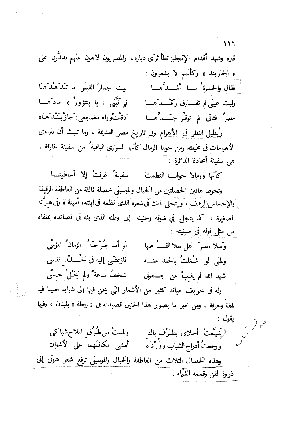 وربما كانت موسيقاه أروع خصاله الفنية، فلا تستمع إلى شيء من شعره حتى تعرفه، وإن لم يذكر لك اسمه ما دامت أذنك قد تعودت سماع شعره، وثبتت في نفسك نغماته التي تتوالى نغمة حلوة بجانب نغمة حلوة. ولا نغلو إذا قلنا: إن شعره يؤلف أروع ألحان عرفت في عصرنا الحديث؛ إذ نراه يعتصر من الألفاظ والأساليب خير ما فيها من ألحان، تسعفه في ذلك فطرة موسيقية رائعة، تقيس قياسًا دقيقًا ذبذبات الحروف والحركات وتآلف النغم في الألفاظ والكلمات.