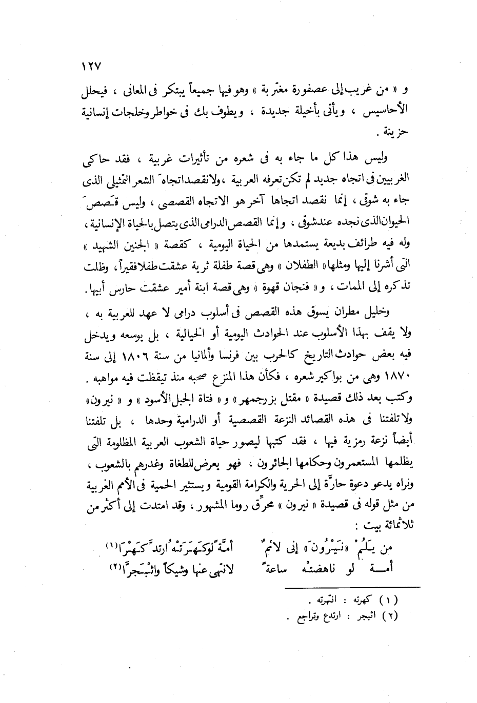 وهي قصيدة باهرة، وبها كل طوابع الجديد عند خليل مطران، فهي تجربة شعورية كاملة، صب فيها نفسه المليئة بالأوجاع والآلام، ولم يصبها فقط؛ بل صب أيضًا عناصر الطبيعة من حوله بعد أن أودعها نفس القروح والأوصاب. وتحتل الطبيعة في شعر مطران حيزًا واضحًا، ومن أجمل قصائده "وردة ماتت" و"النوارة أو زهرة المارغريت" و"بنفسجة في عروة" و"نرجسة"