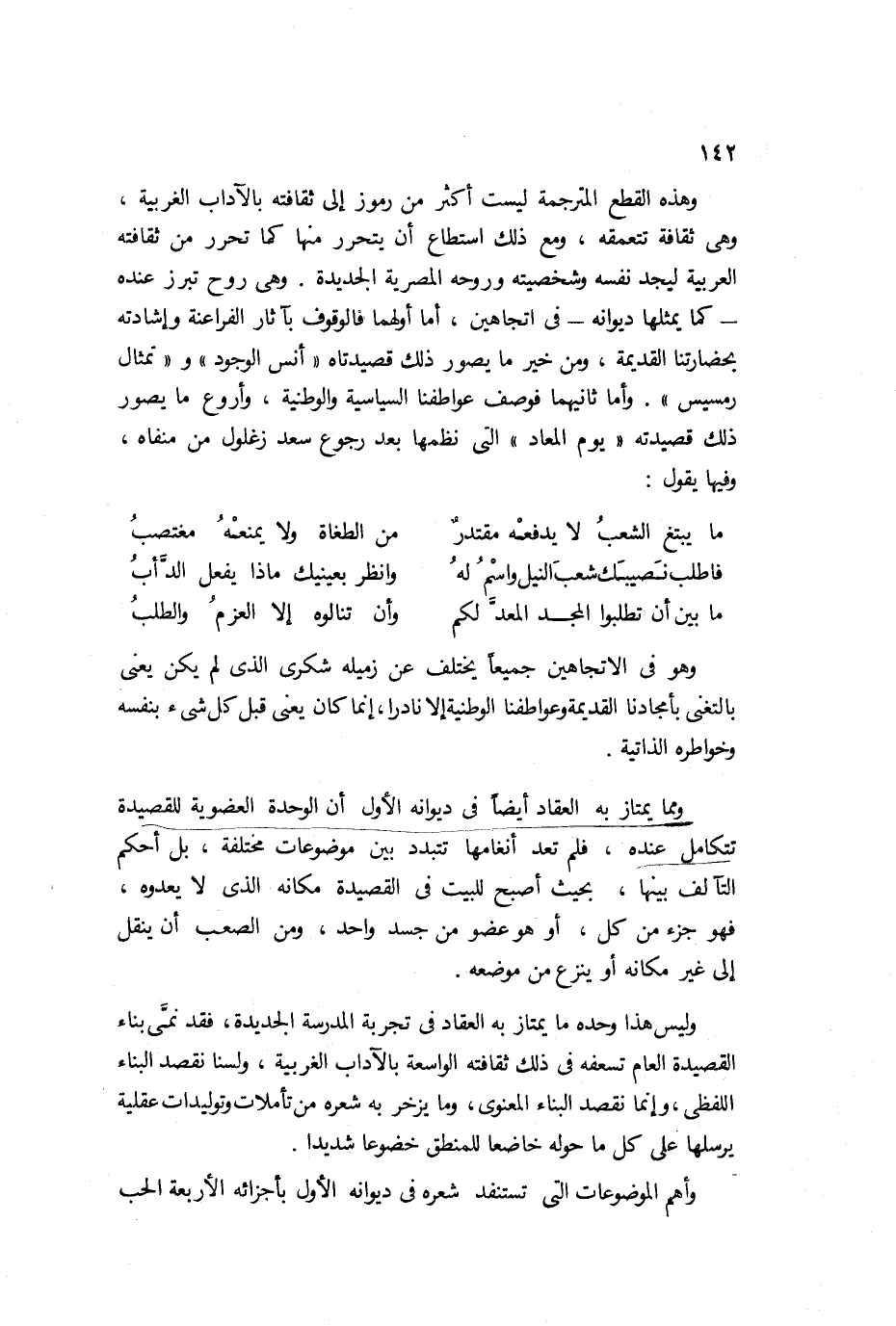 على مثال ما عُنِيَ شوقي بمعارضة البحتري مثلًا. فالعقاد يستقل في شعره وقوالبه عن ابن الرومي وغيره على نحو ما يستقل خليل مطران عن شعراء العرب، فهو مثله يستوعب الصياغة القديمة؛ ولكنه لا يفنى فيها ولا يتحول إلى قوالبها يصب فيها أو يسكب ما في نفسه، فحسبه أن يتمثلها، ثم تصبح ملكًا له يستخدمها كما تشاء ملكته الفنية دون أن يظهر عنده اتباع أو تقليد واضح إلا في القليل النادر.