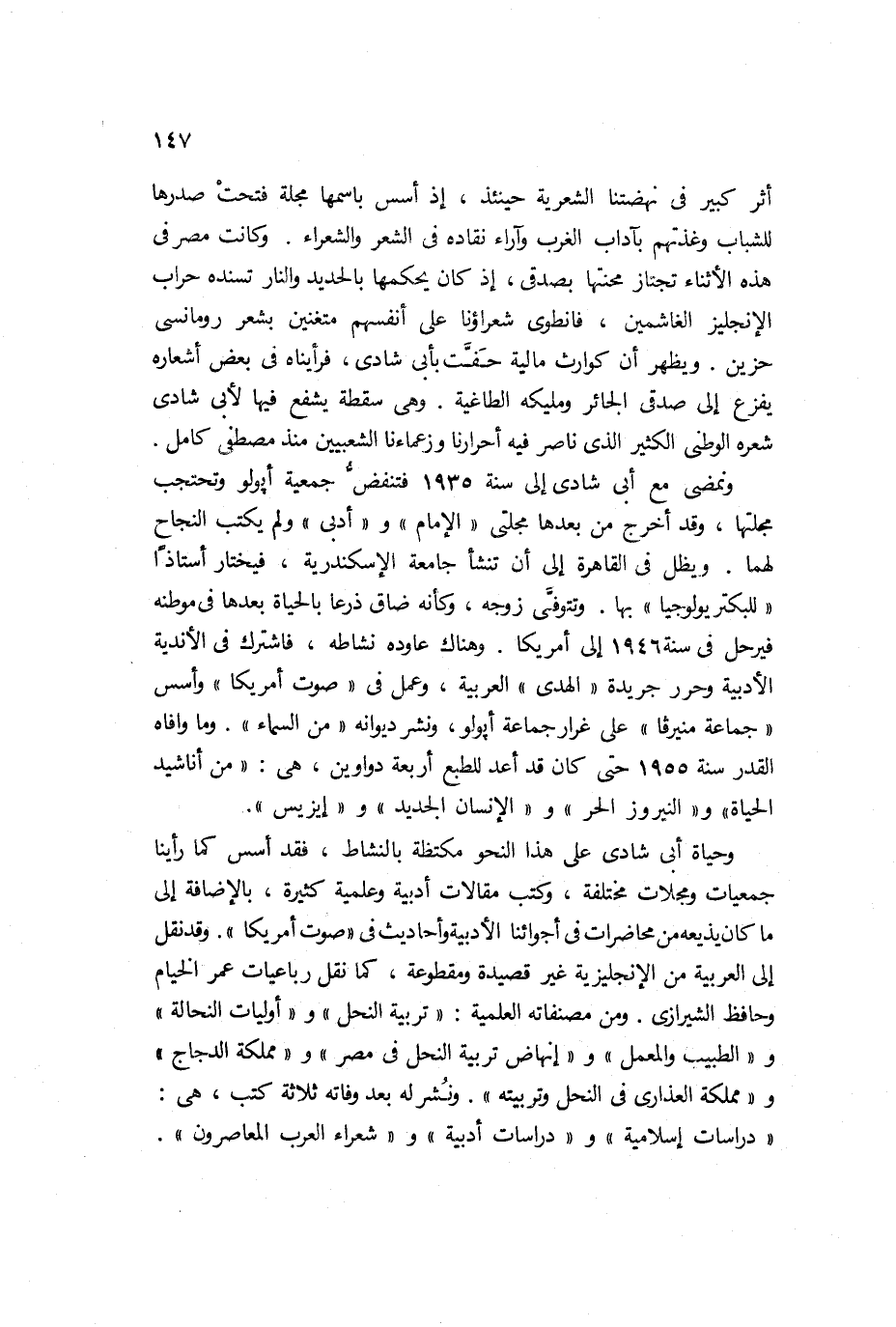 وكان في أوقات فراغه يُقبل على نظم الشعر في سرعة شديدة، فكثر إنتاجه الشعري كثرة مفرطة، وما نصل إلى سنة 1932 حتى نراه يؤلف جماعة أبولو التي تحدثنا عنها في غير هذا الموضع، والتي ظلت قائمة إلى سنة 1935، وكان لها