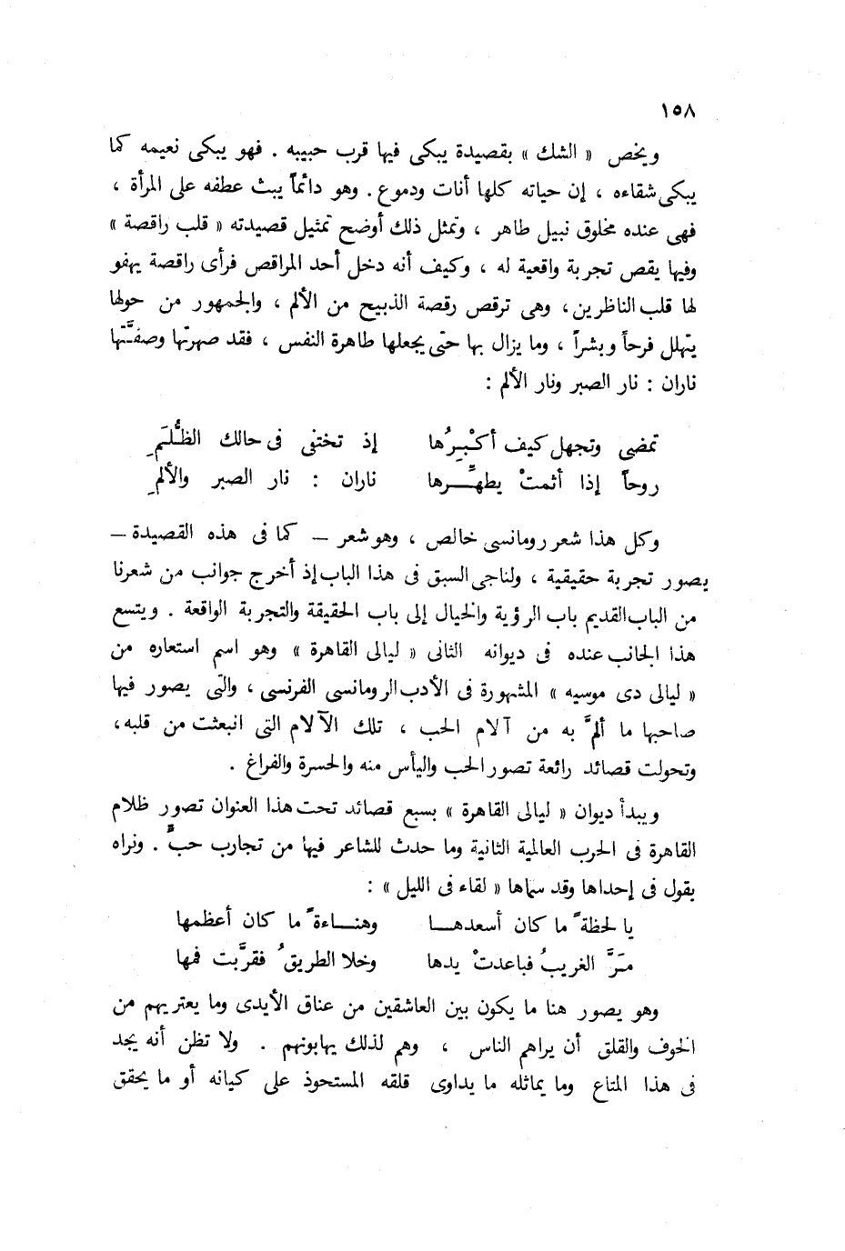 وعلى هذا النسق فهم ناجي الشعر، فلم يصور عواطف الناس السياسية والوطنية من حوله؛ بل انصرف إلى نفسه يتغنى بحب شقي عاثر، وهو غناء كله ألم وشجن وارتياب وقلق وهم، غناء عاشق، يخفق دائمًا في حبه، ولا يجد في نفسه ولا في يده منه إلا الذكرى الممضة المحرقة، ومن خير ما يصور ذلك قصيدتاه: "الناي المحترق" و"العودة"، وفيها يتغنى بذكرياته الحزينة لمعاهد شبابه، وما كان له فيها من حب ذبل قبل أوانه، على مثل ما نرى في قوله: