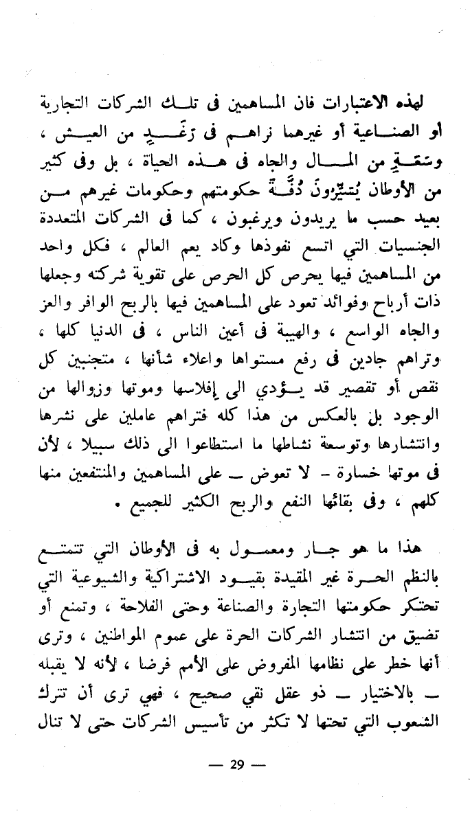 هذا ما هو جار ومعمول به في الأوطان التي تتمتع بالنظم الحرة غير المقيدة بقيود الاشتراكية والشيوعية التي تحتكر حكومتها التجارة والصناعة وحتى الفلاحة، وتمنع أو تضيق من انتشار الشركات الحرة على عموم المواطنين، وترى أنها خطر على نظامها المفروض على الأمم فرضا، لأنه لا يقبله - بالاختيار - ذو عقل نقي صحيح، فهي ترى أن تترك الشعوب التي تحتها لا تكثر من تأسيس الشركات حتى لا تنال