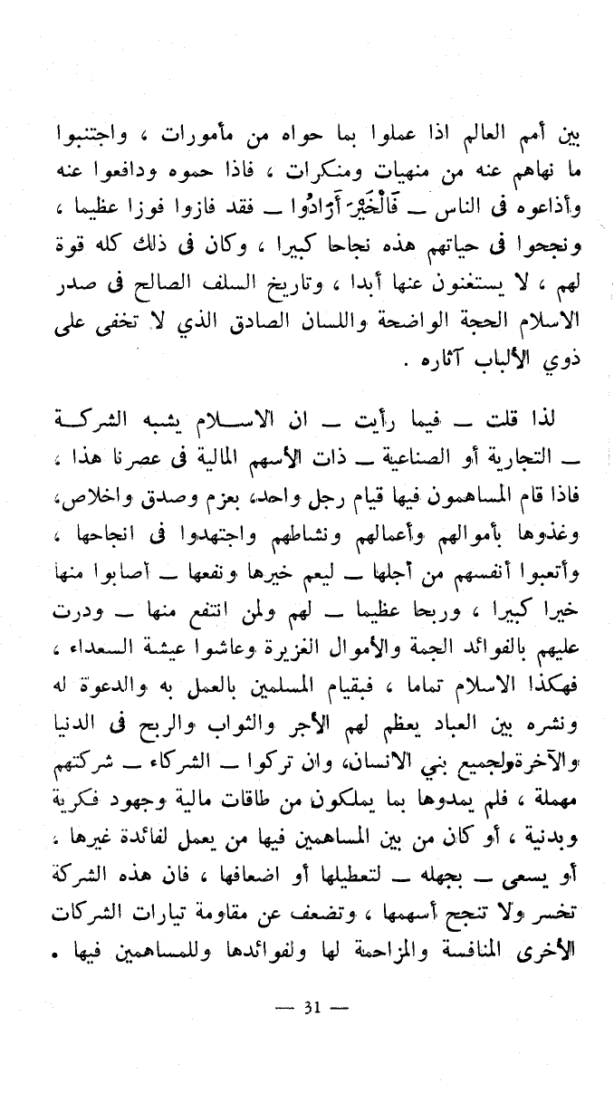 لذا قلت - فيما رأيت - أن الإسلام يشبه الشركة - التجارية أو الصناعية - ذات الأسهم المالية في عصرنا هذا، فإذا قام المساهمون فيها قيام رجل واحد، بعزم وصدق وإخلاص، وغذاوها بأموالهم وأعمالهم ونشاطهم واجتهداوا في إنجاحها، وأتعبوا أنفسهم من أجلها - ليعم خيرها ونفعها - أصابوا منها خيرا كبيرا، وربحا عظيما - لهم ولمن انتفع منها - ودرت عليهم بالفوائد الجمة والأموال الغزيرة وعاشوا عيشة السعداء، فهكذا الإسلام تماما، فبقيام المسلمين بالعمل به والدعواة له ونشره بين العباد يعظم لهم الأجر والثواب والربح في الدنيا والآخر ولجميع بني الإنسان، وإن تركوا - الشركاء - شر كتهم مهملة، فلم يمدوها بما يملكون من طاقات مالية وجهود فكرية وبدنية، لو كان من بين المساهمين فيها من يعمل لفائدة غيرها، أو يسعى - بجهله - لتعطيلها أو إضعافها، فإن هذه الشركة تخسر ولا تنجح أسهمها، وتضعف عن مقاومة تيارات الشركات الأخرى المنافسة والمزاحمة لها ولفوائدها وللمساهمين فيها.